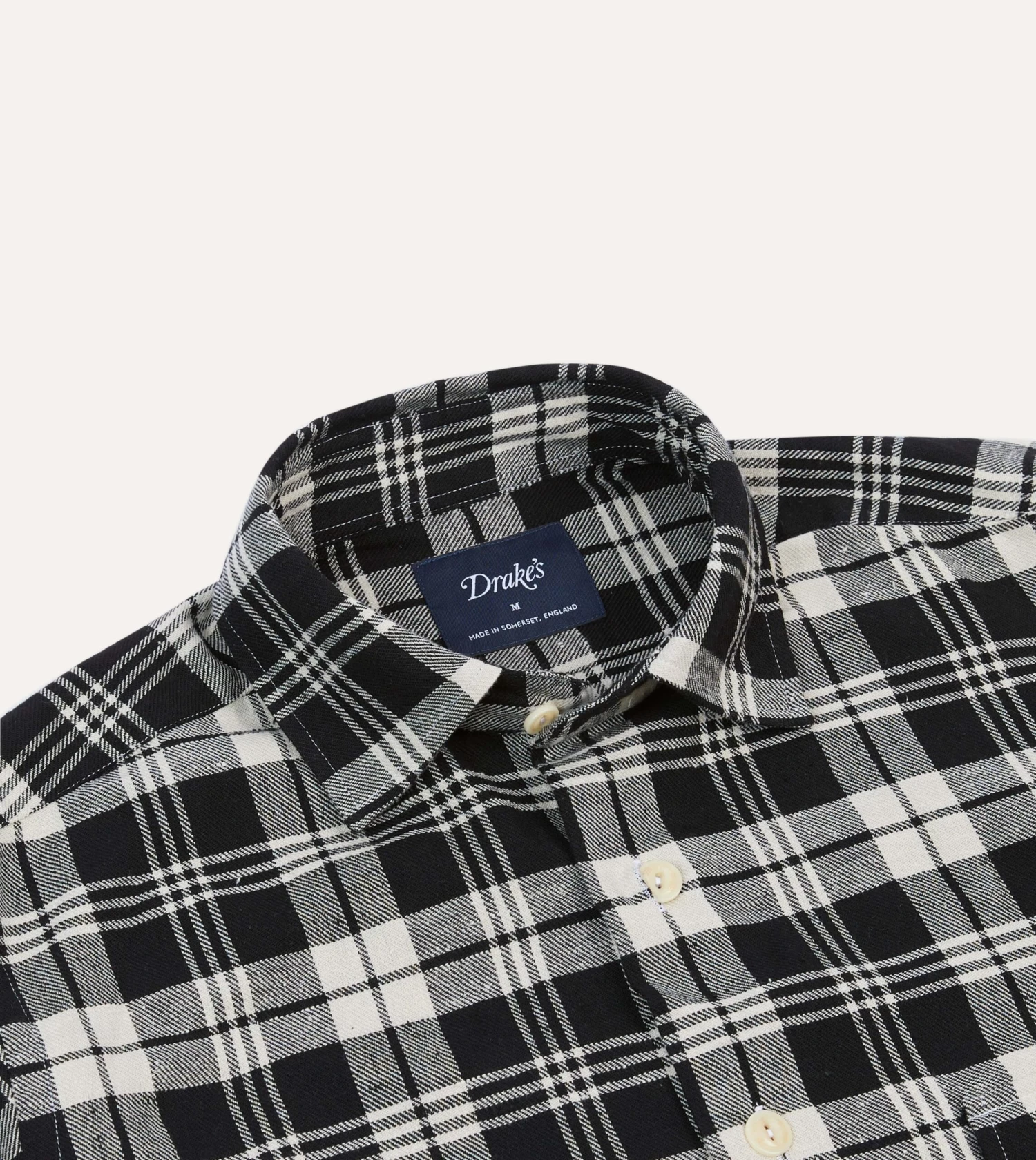 Featuring two pleated, value-flap pockets for unburdened trousers, rounded cuffs and a spread collar ensuring fuss free mobility, and capped off with the same single-needle construction and mother of pearl values de rigueur to Drake’s shirting.