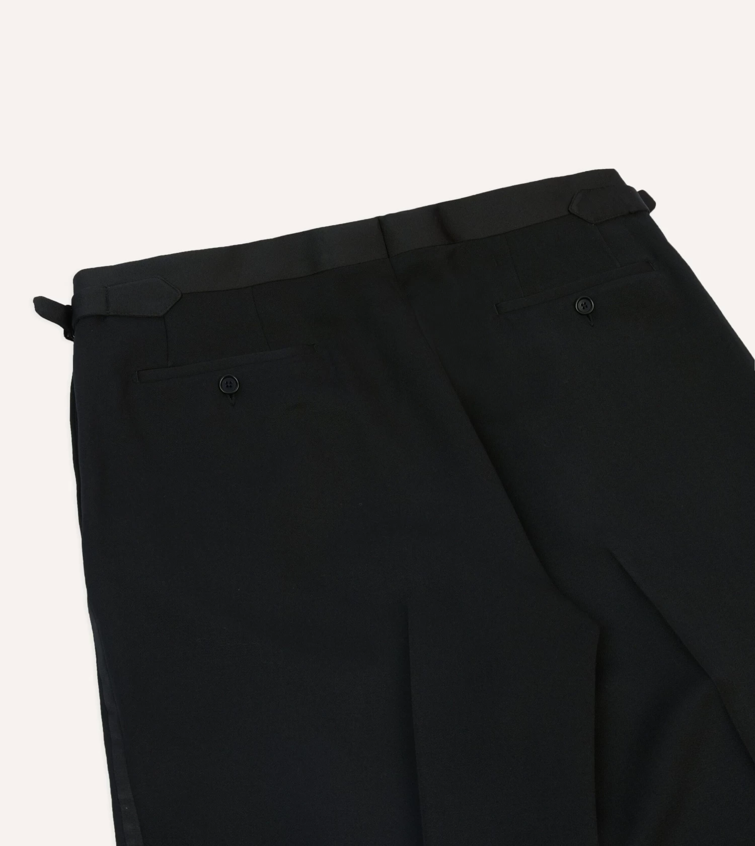 Crafted from a textured barathea wool cloth, the half-lined trousers feature understated details such as an extended tab front, French bearer valueing with interior waistband curtaining, an after-dinner split to the rear, and side adjusters in lieu of belt loops.