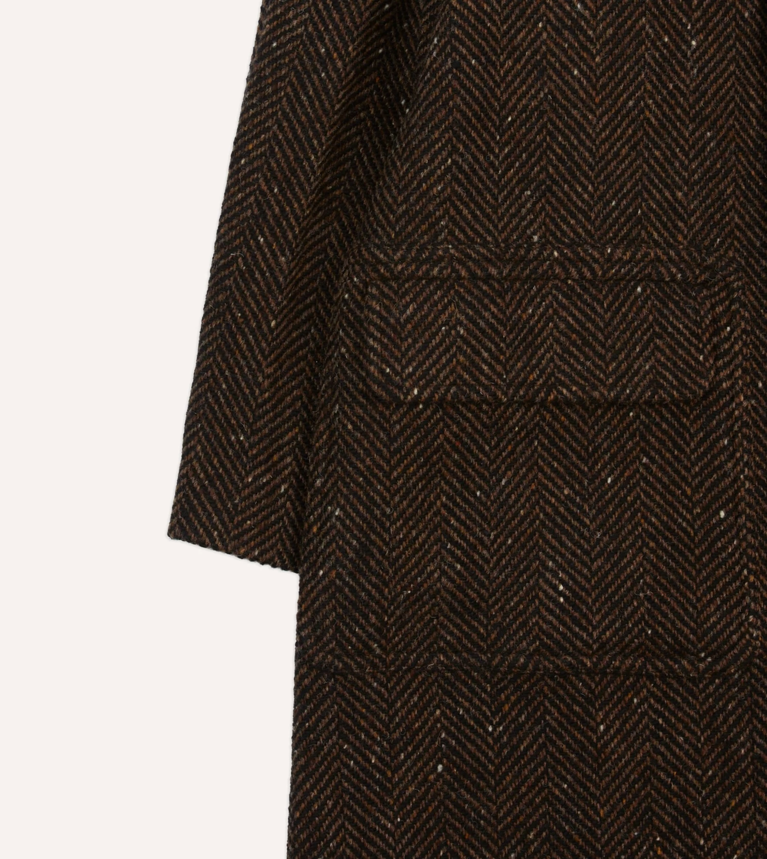 Unstructured and practical in design, the coat features a sturdy, serviceable collar and valueed sleeve straps to defend against the elements, while split raglan shoulders, a fly front and considerable rear vent offer uninhibited manoeuvrability.