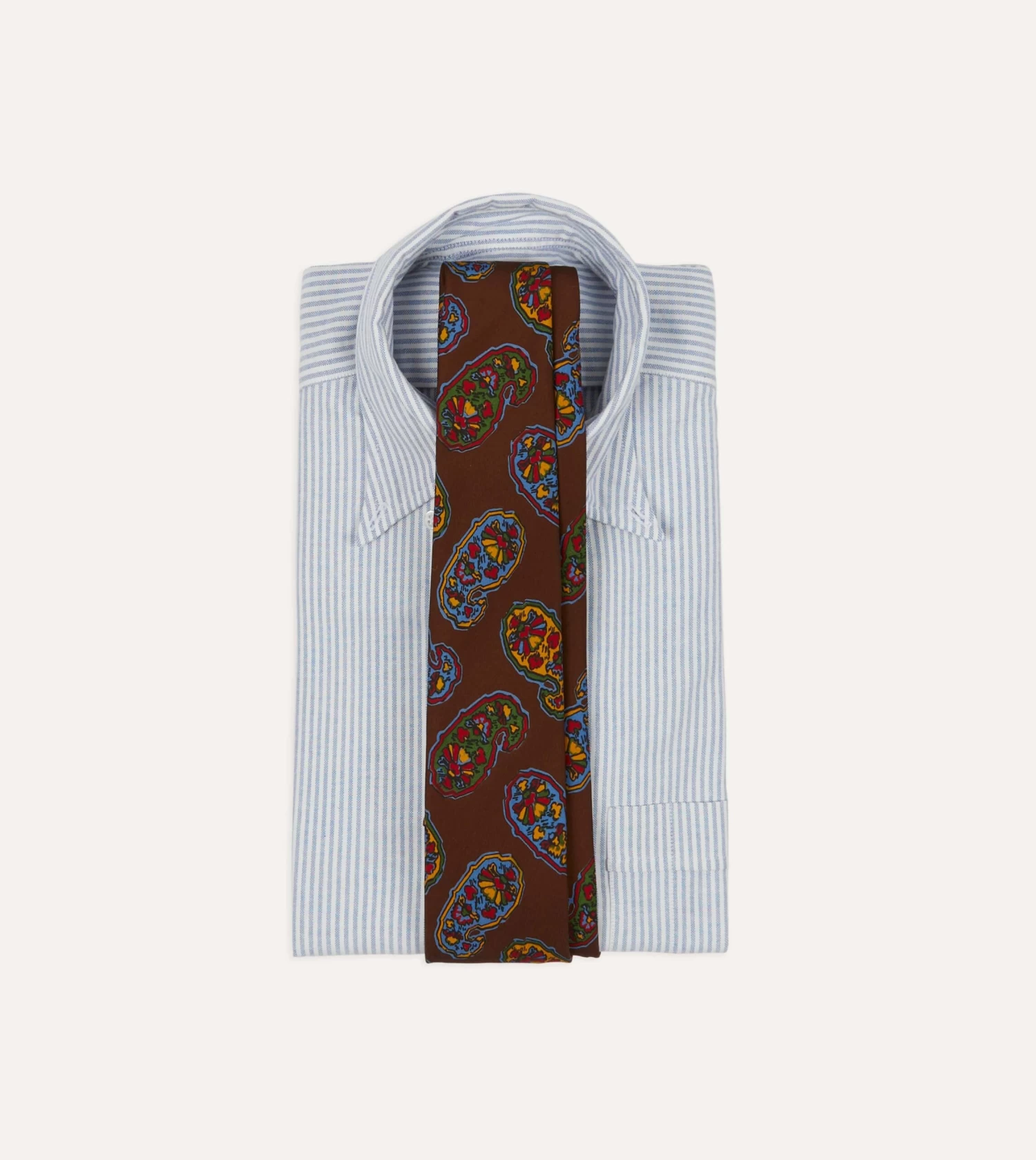 This design, direct from our extensive archive and printed on pure silk, features a classic paisley, and is reminiscent of the elegant late 1960s neckwear favoured by rockstars and royalty alike. The tie is pure silk with hand-rolled blades, made by hand in London.
