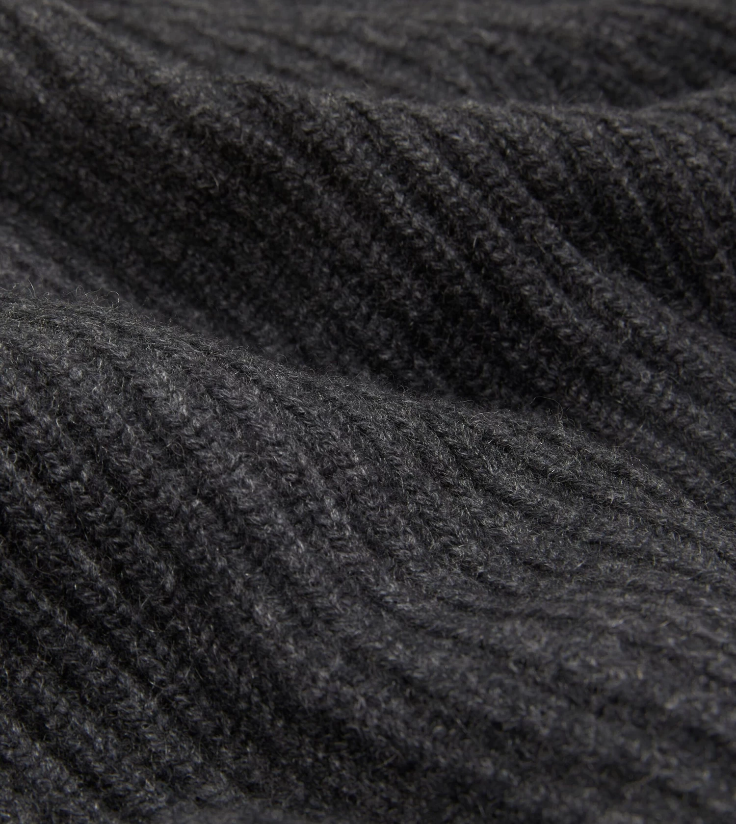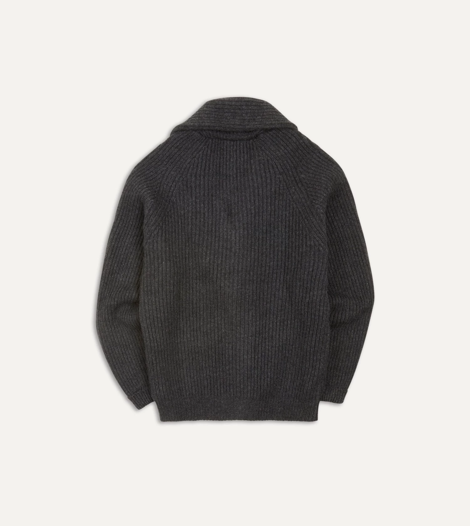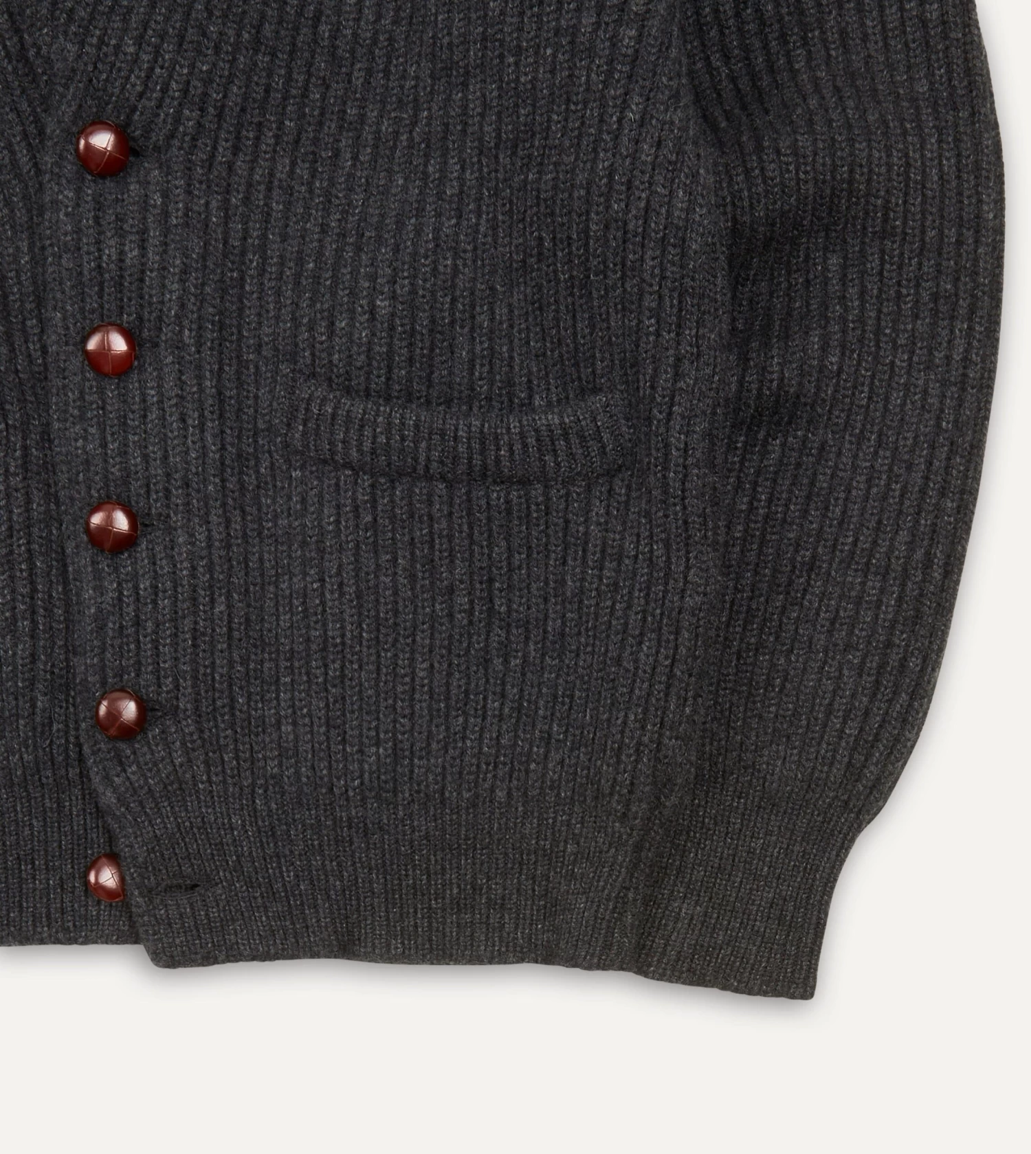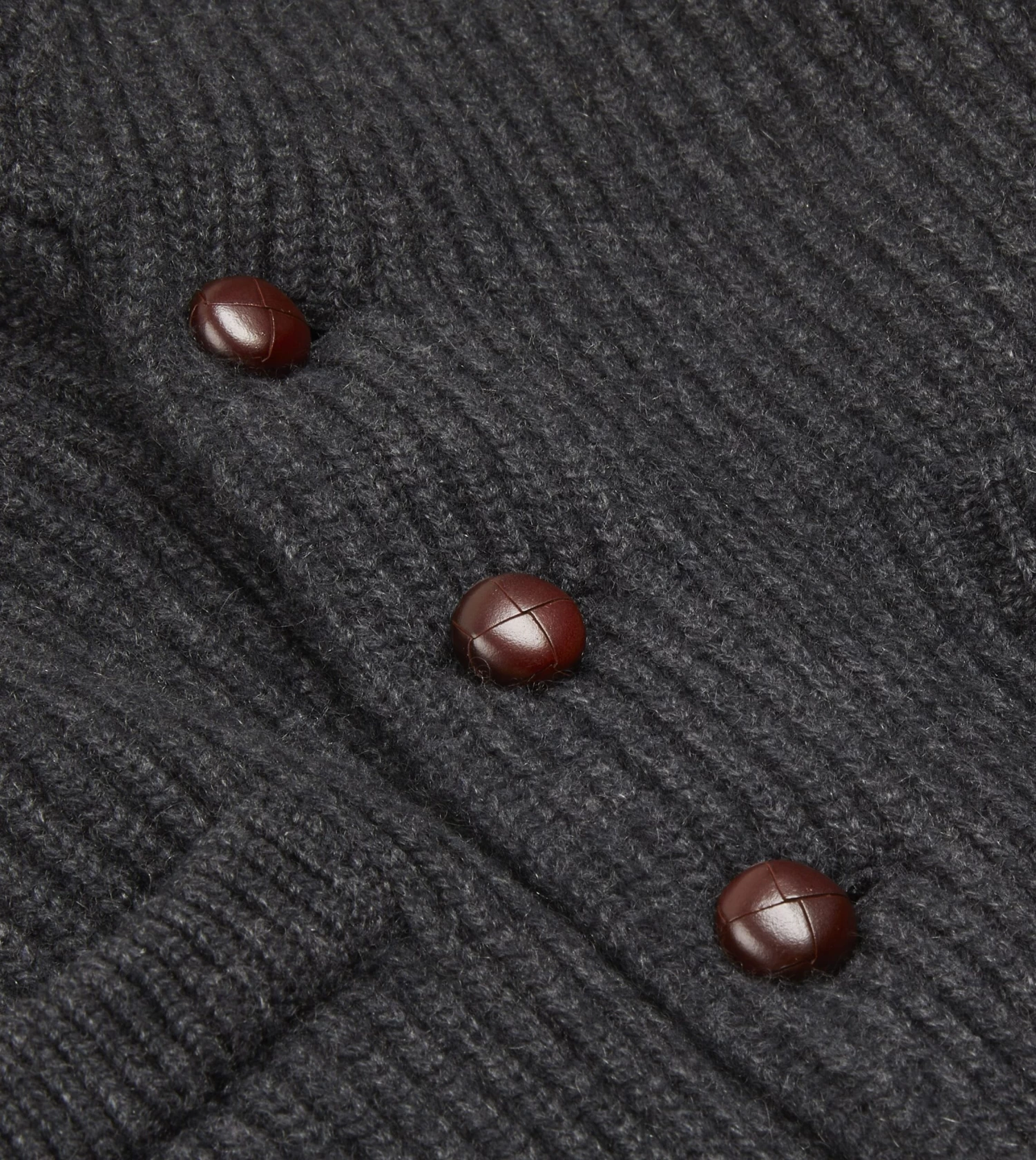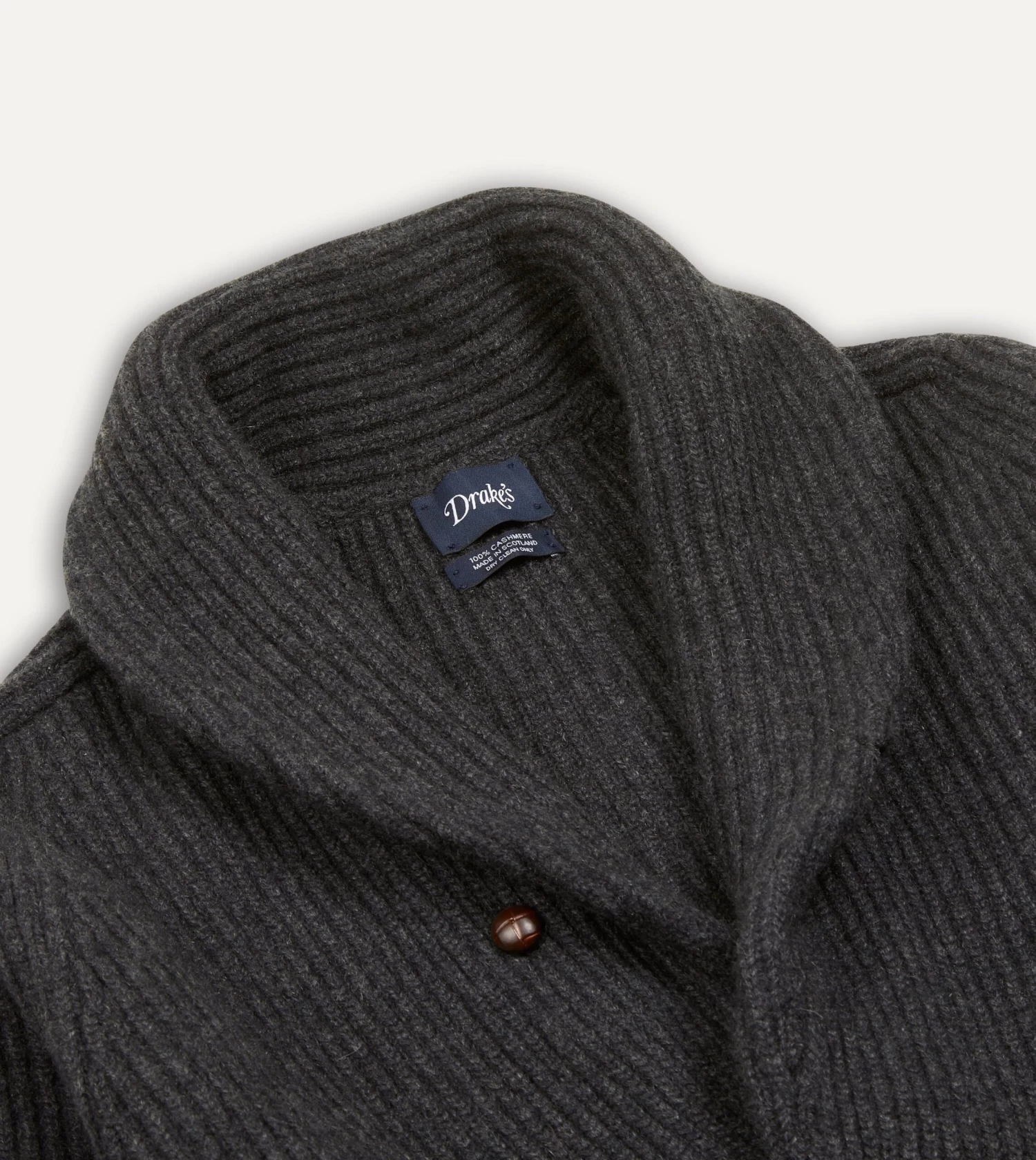 Our luxurious, iconic shawl-collared cardigan defines casual elegance. The garment is knitted from the finest ribbed four-ply ribbed cashmere, with five-braid British tan leather values, two front pockets, classic raglan shoulders, and a knitted cashmere throat loop closure.