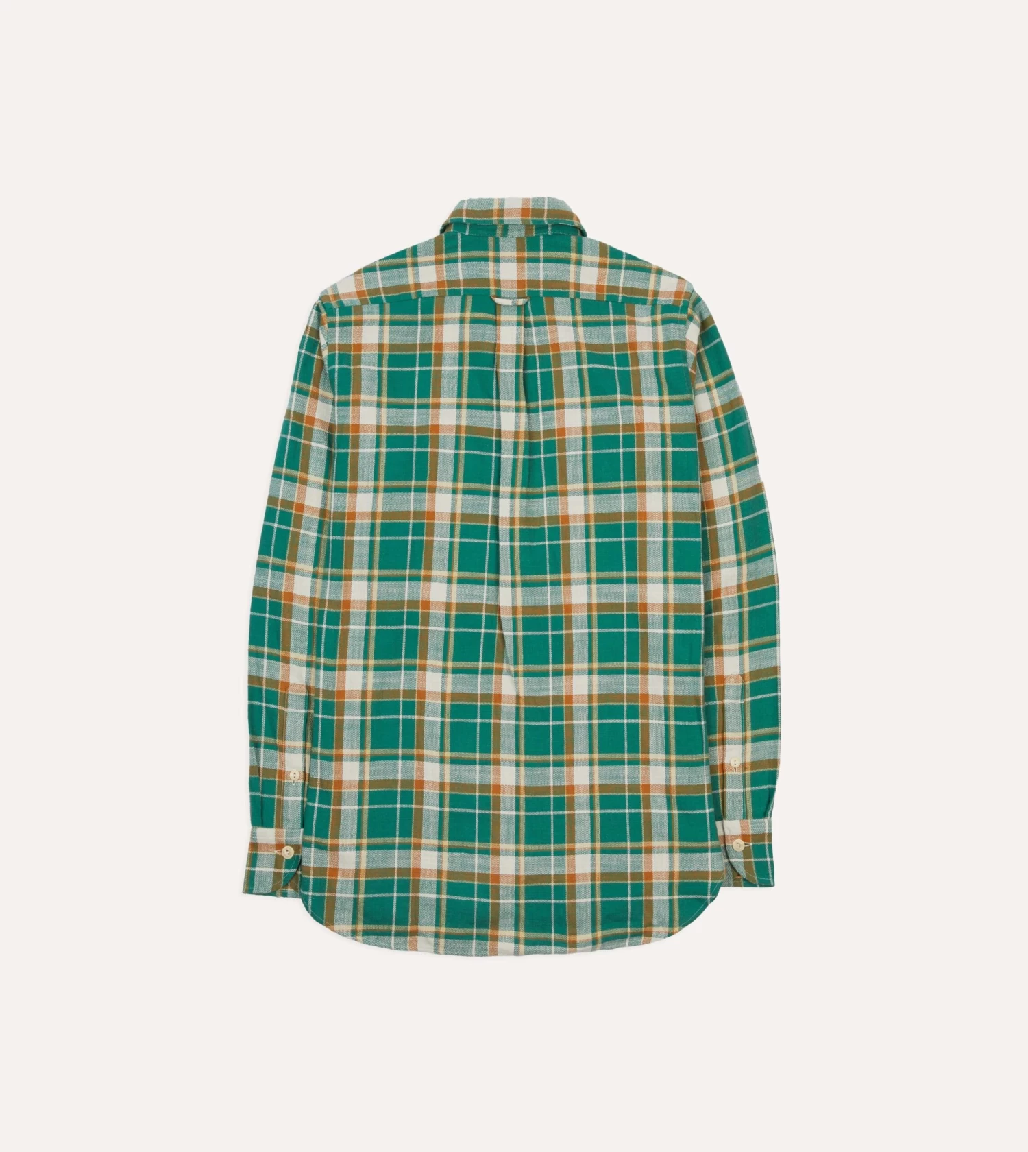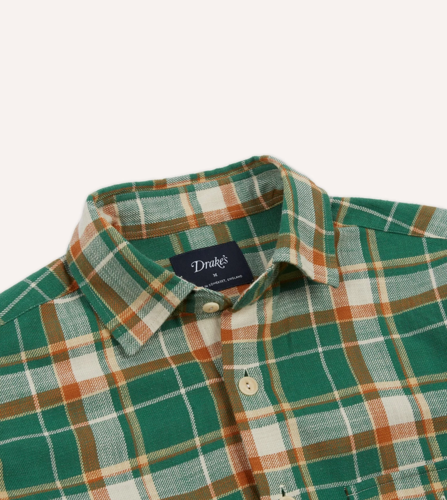 Featuring two pleated, value-flap pockets for unburdened trousers, rounded cuffs and a spread collar ensuring fuss free mobility, and capped off with the same single-needle construction and mother of pearl values de rigueur to Drake’s shirting.
