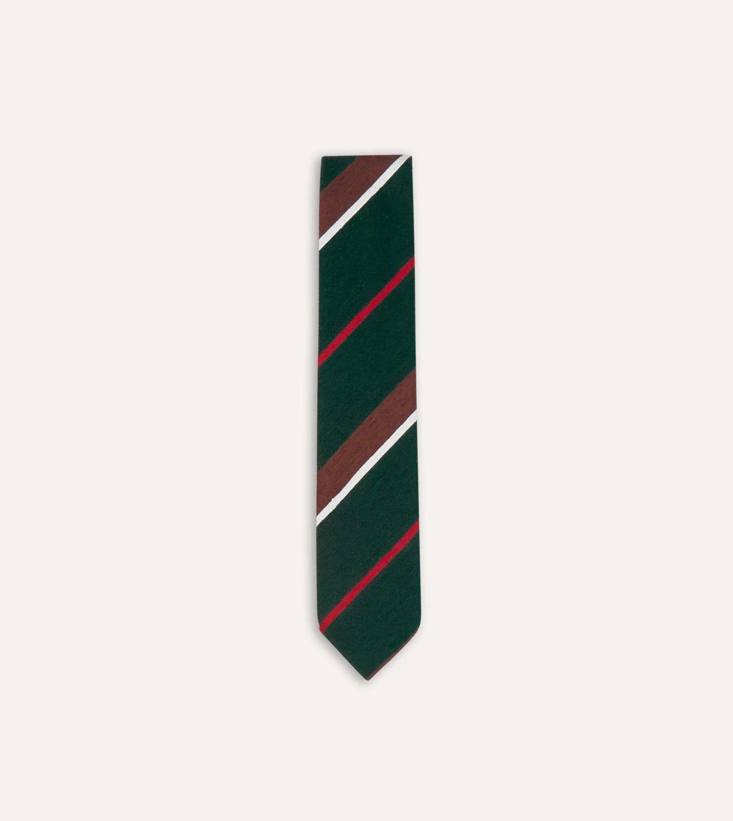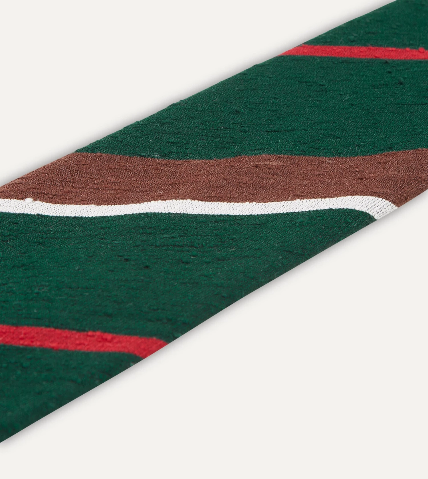 An elegant necktie, handmade in London from Shantung silk, known for its natural slub, featuring a stripe redolent of earlier periods of style, while retaining a distinctly modern feel.