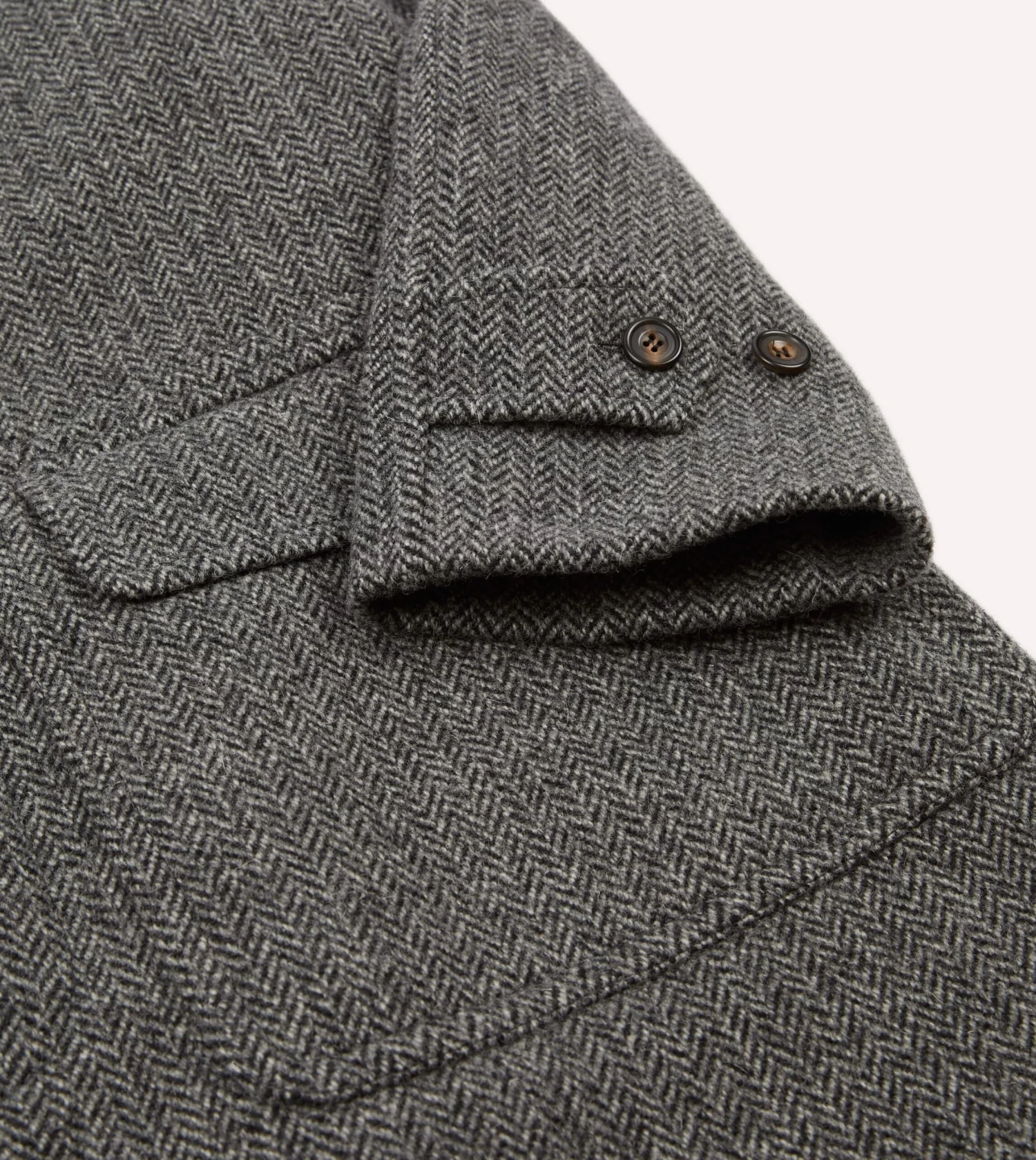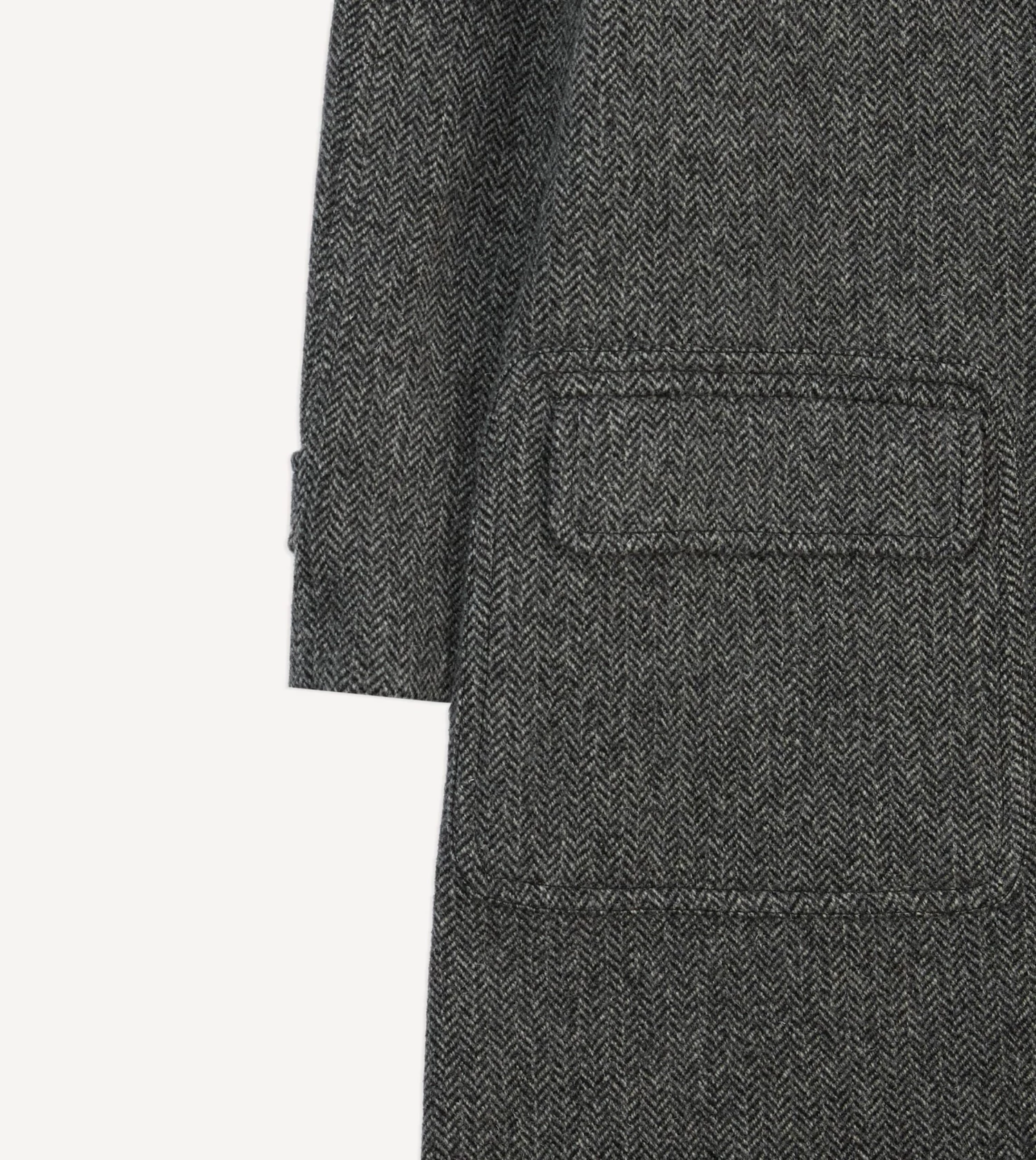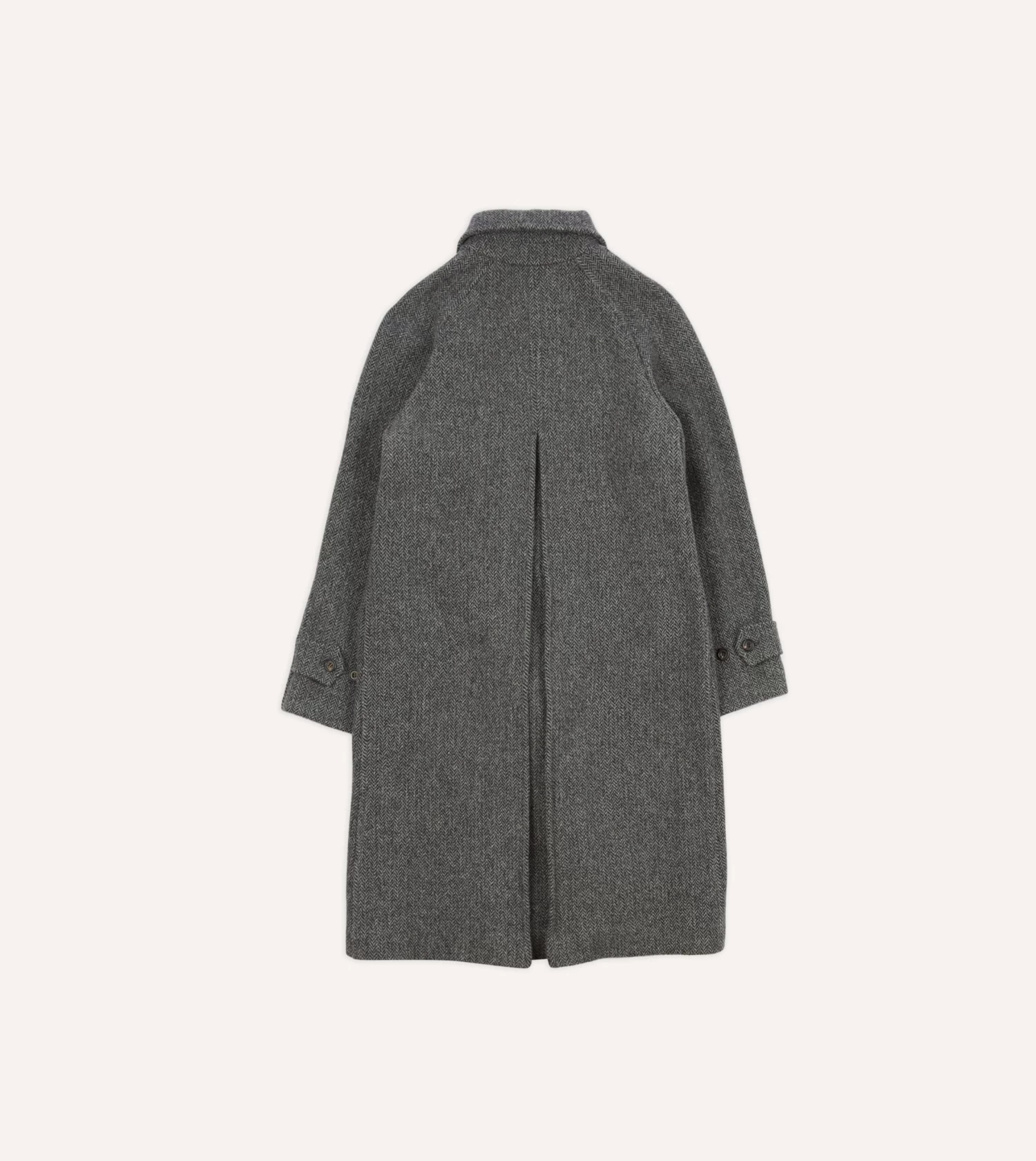 Unstructured and practical in design, the coat features a sturdy, serviceable collar and valueed sleeve straps to defend against the elements, while split raglan shoulders, a fly front and considerable rear vent offer uninhibited manoeuvrability.