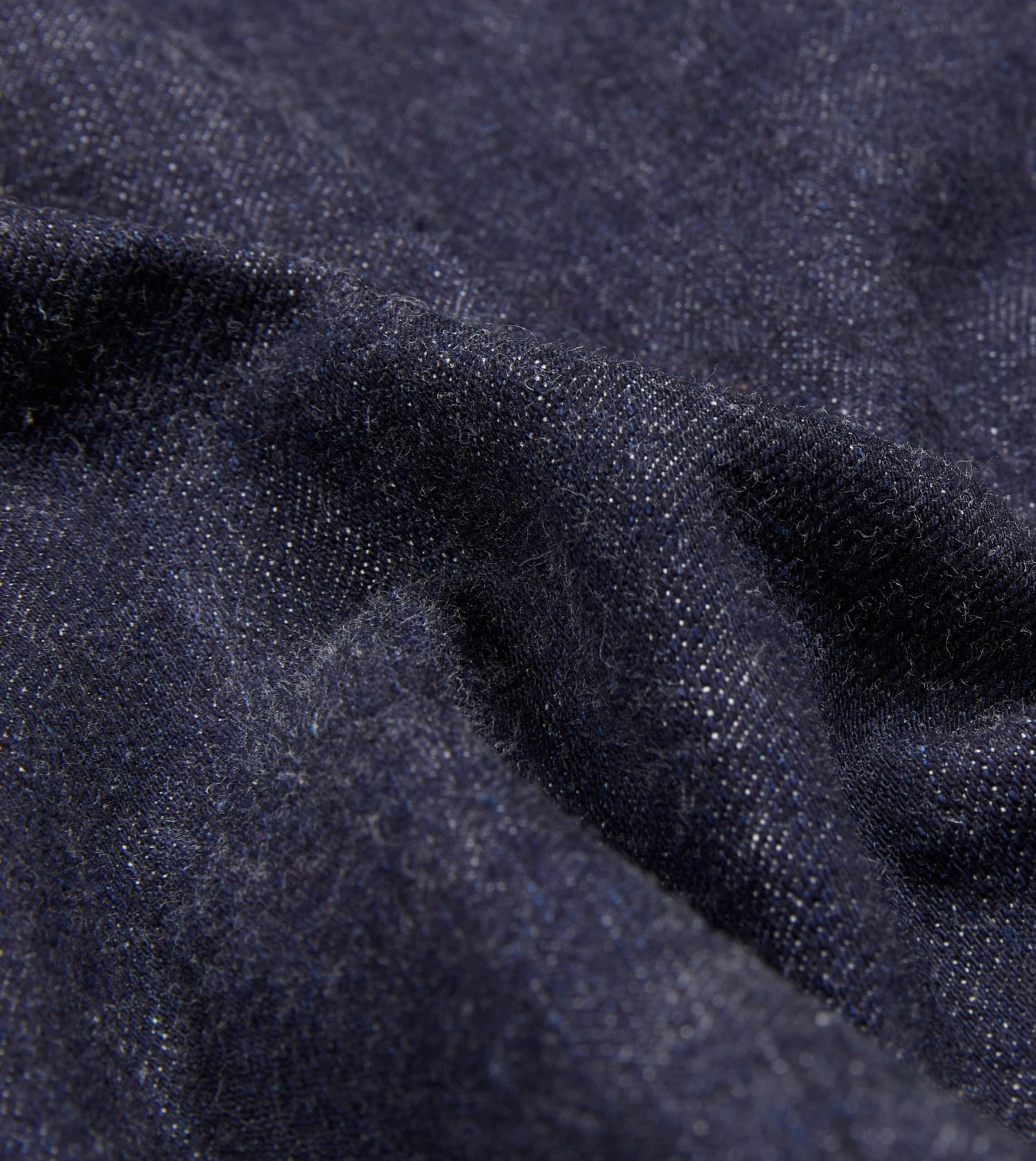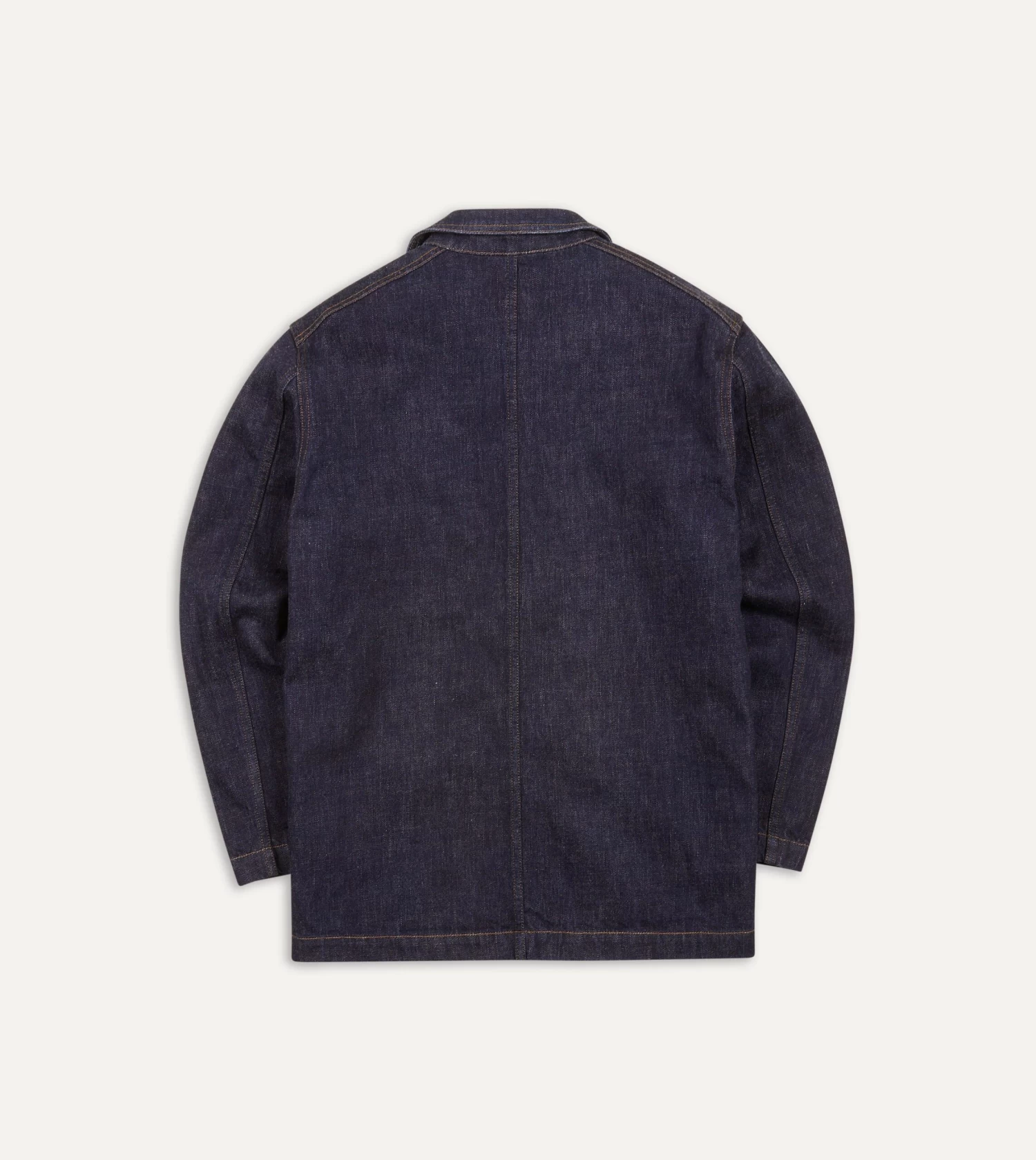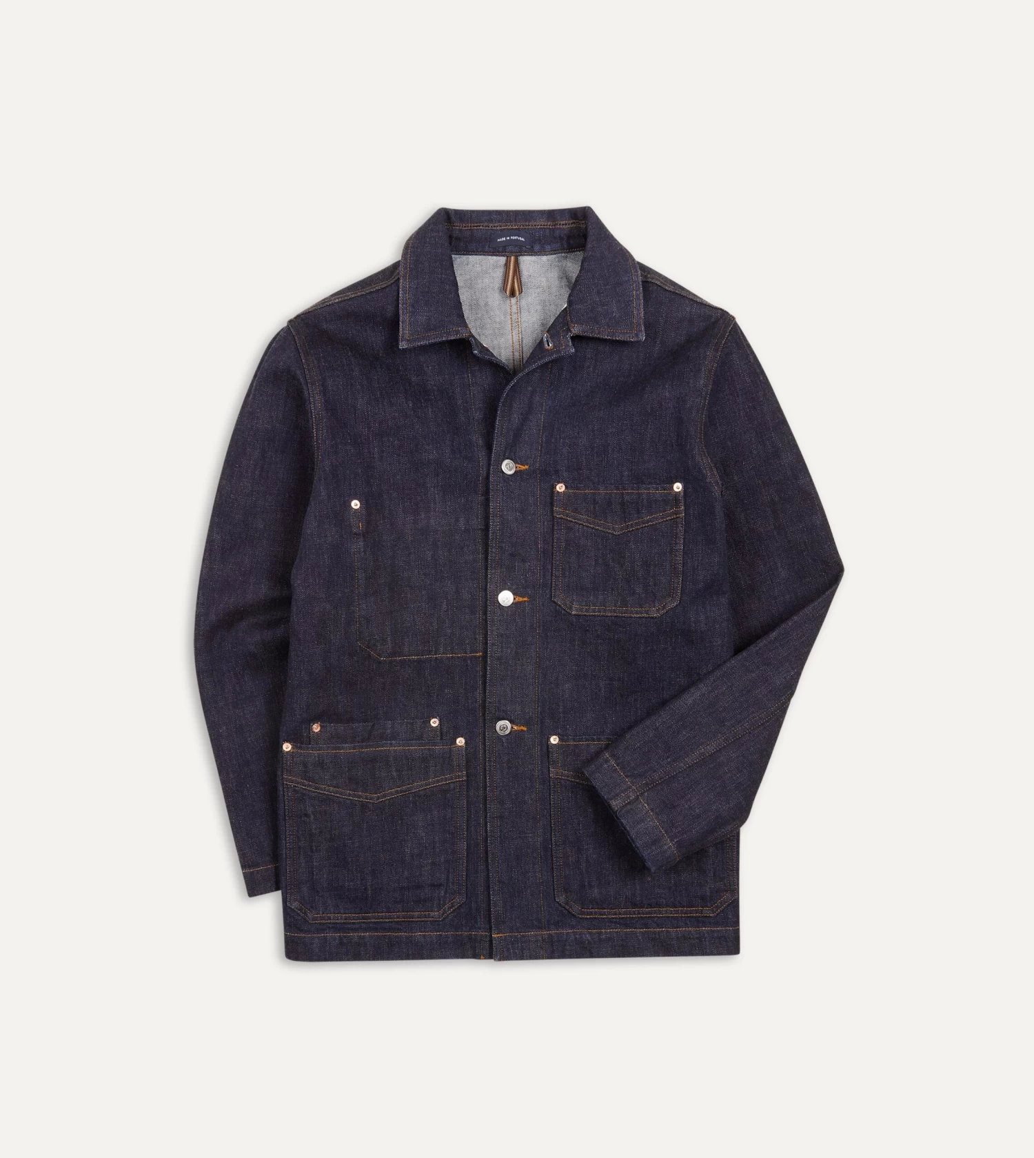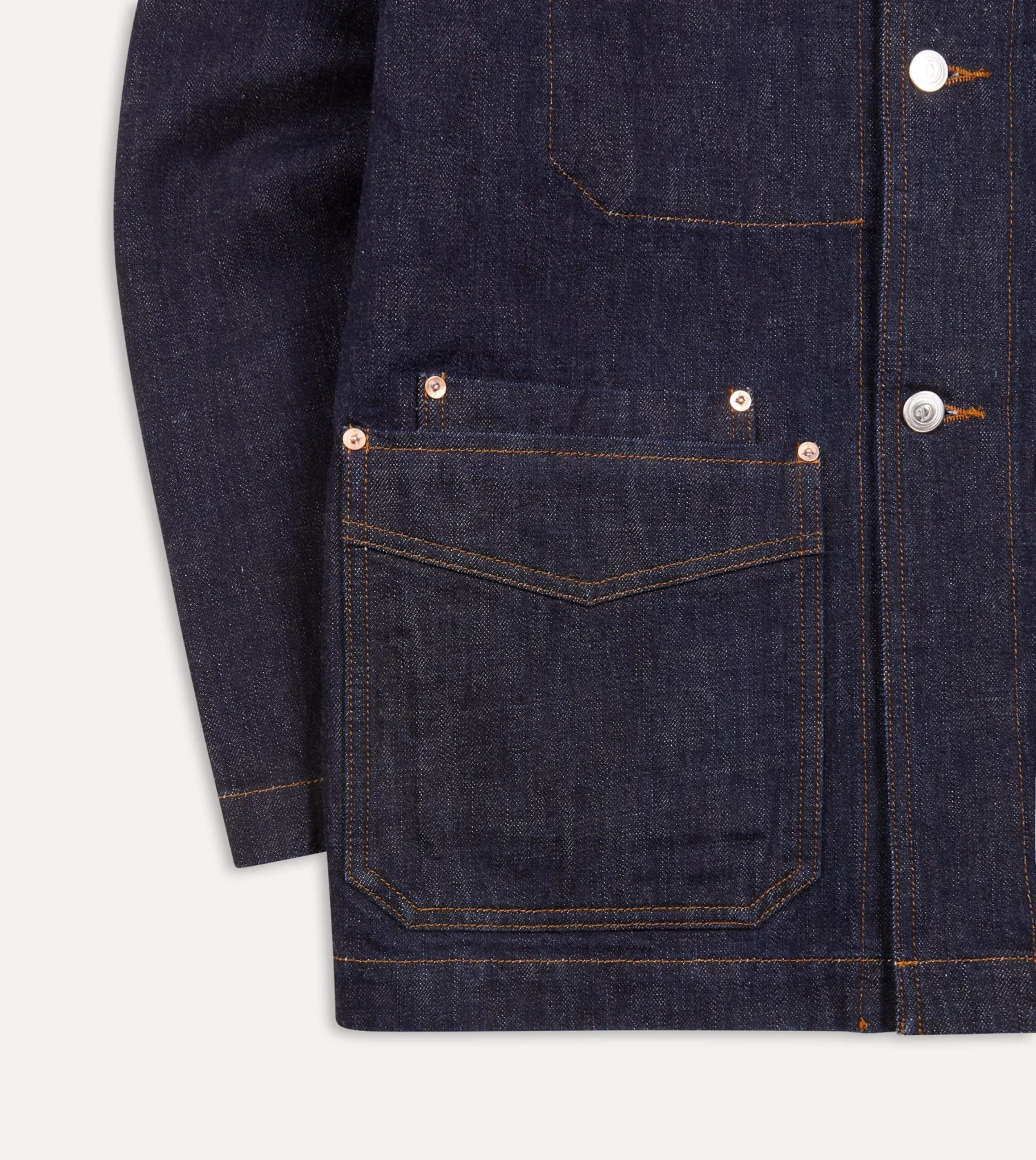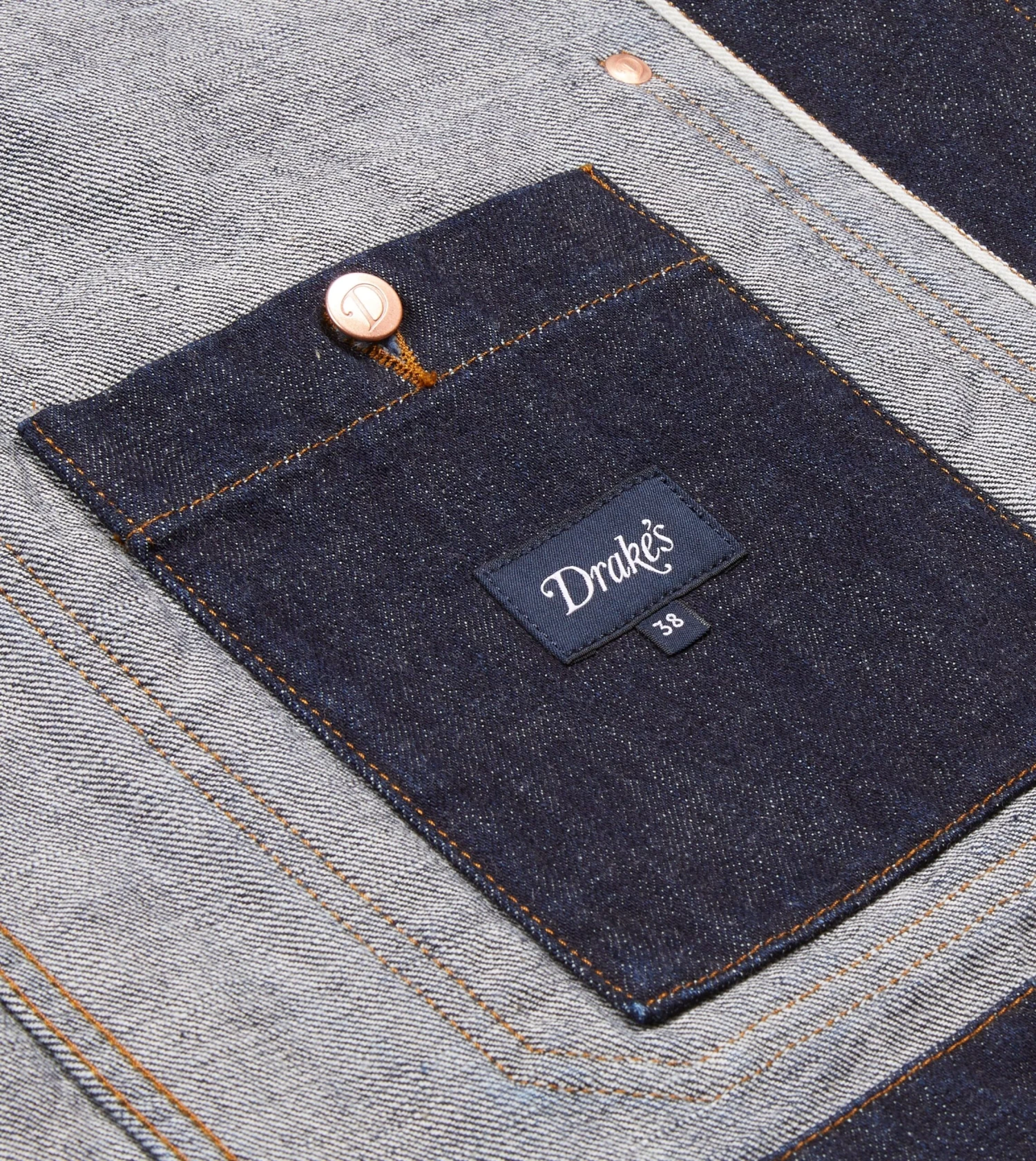 A staple of casual wardrobes the world over, the chore jacket retains its relevance on account of its stylishly spare construction, and its utmost versatility. This version is made from a rugged selvedge denim, with three outer pockets (plus a signature Drake’s ticket pocket peaking out on the left-hand side), and one inner pocket. It is cut generously, with a slightly boxy shape recalling the original workwear garments worn around the turn of the century, as opposed to their slimmed-down, contemporary counterparts.Â