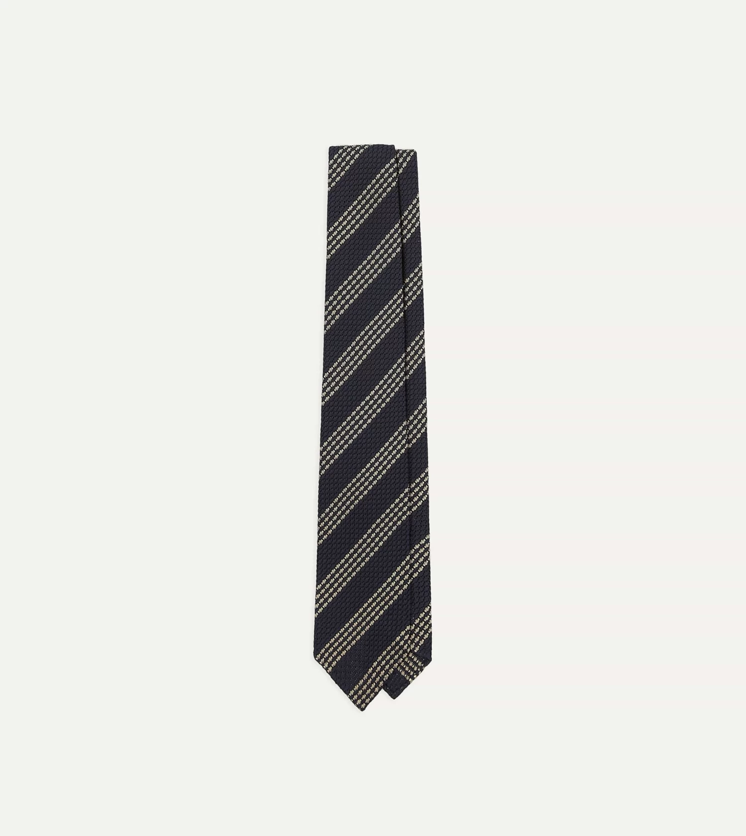 Navy And Silver Stripe Hand Rolled Large Knot Grenadine Tie