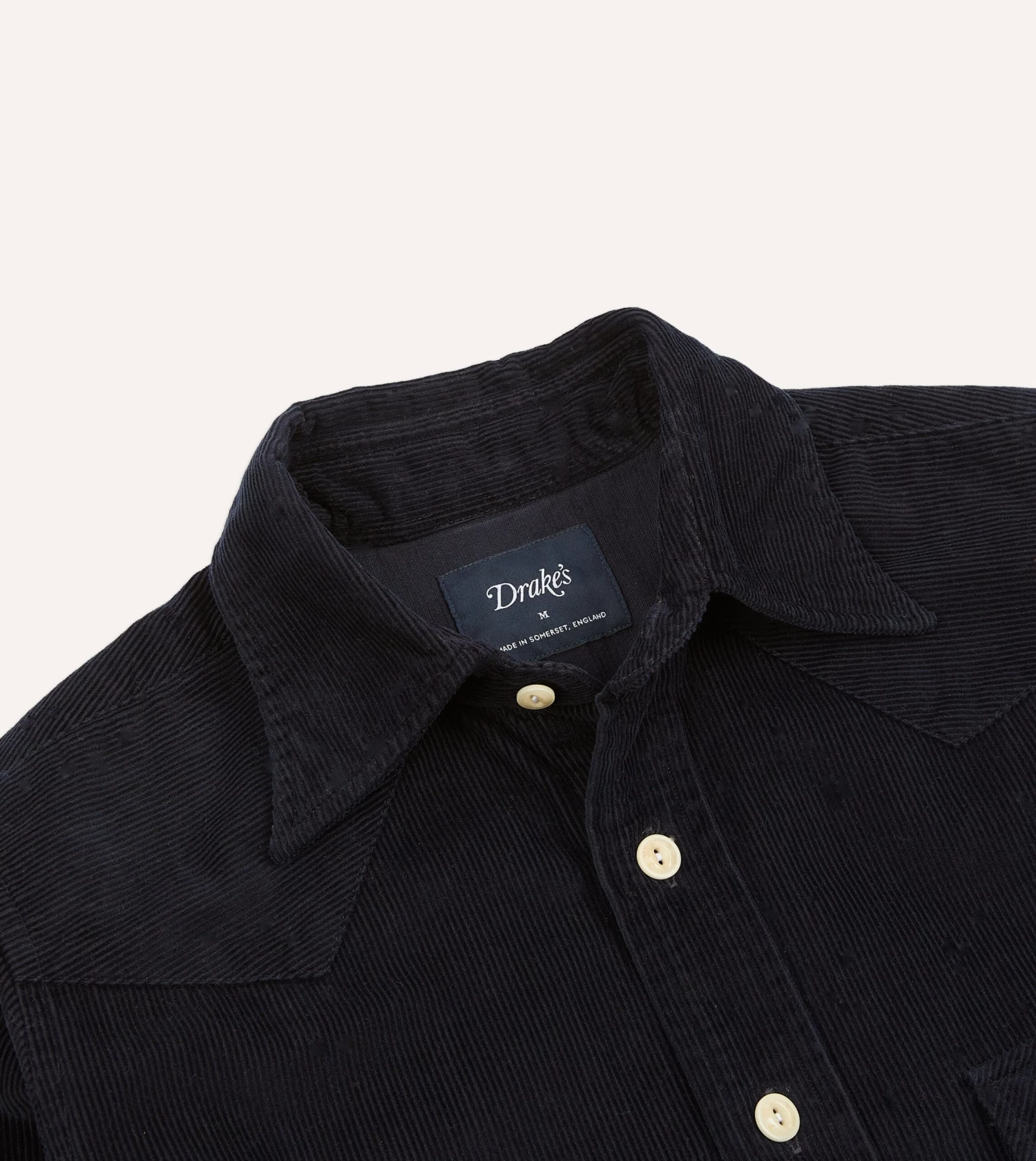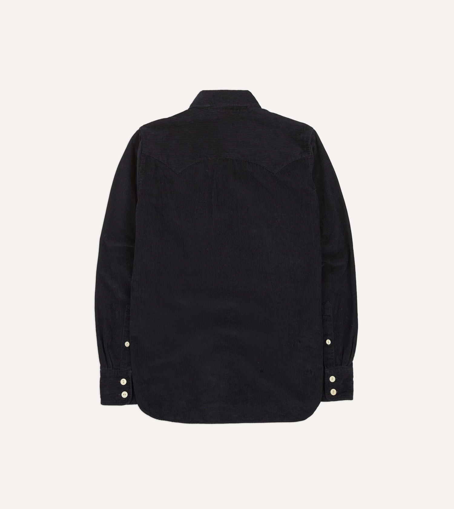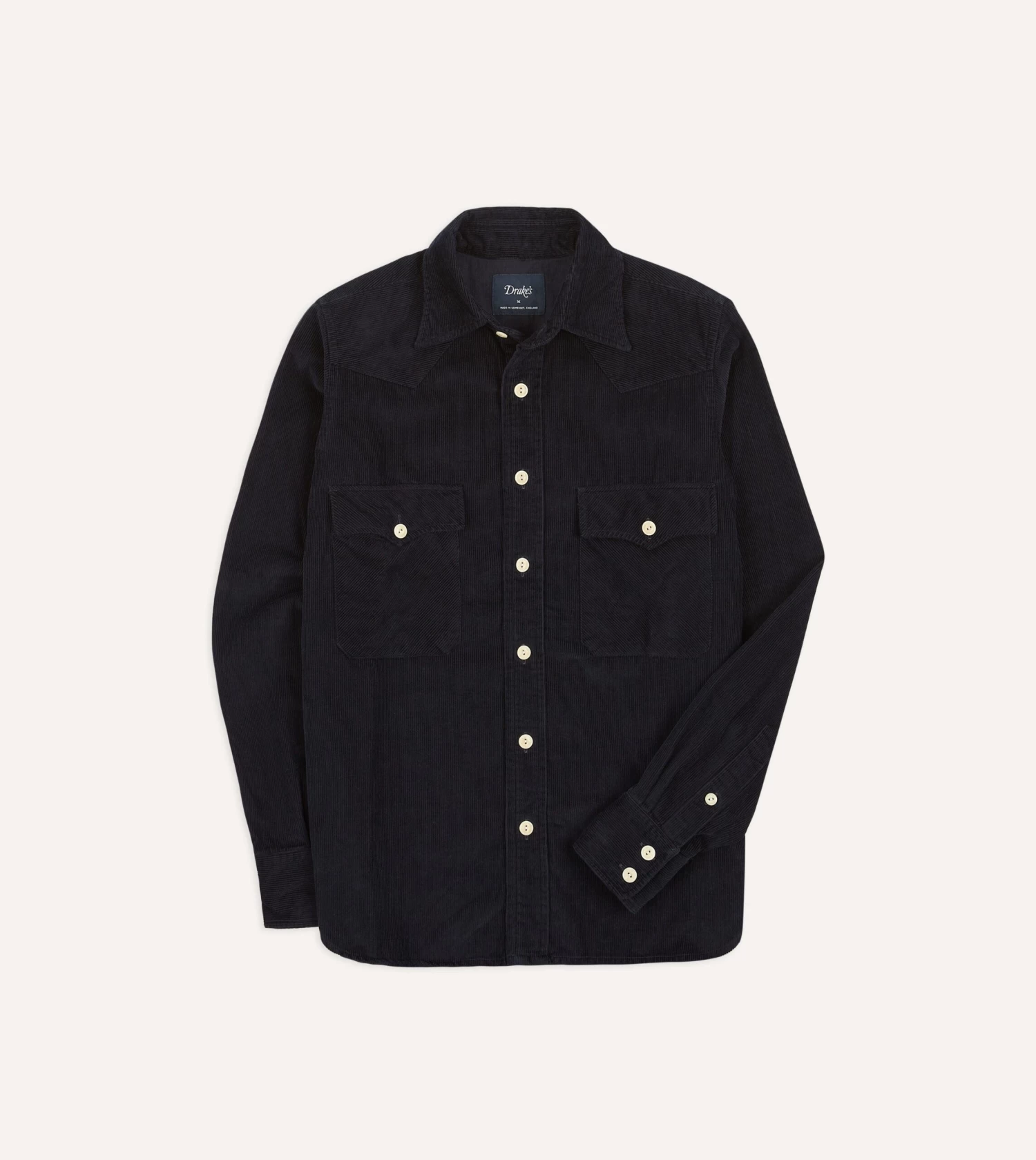The ubiquitous Western shirt receives the Drake’s treatment in the form of our usual single-needle construction and corozo values.