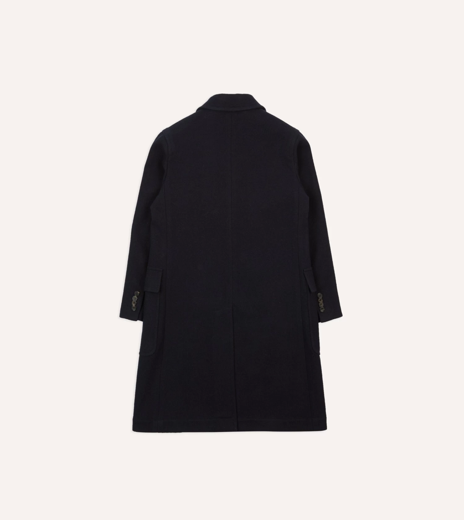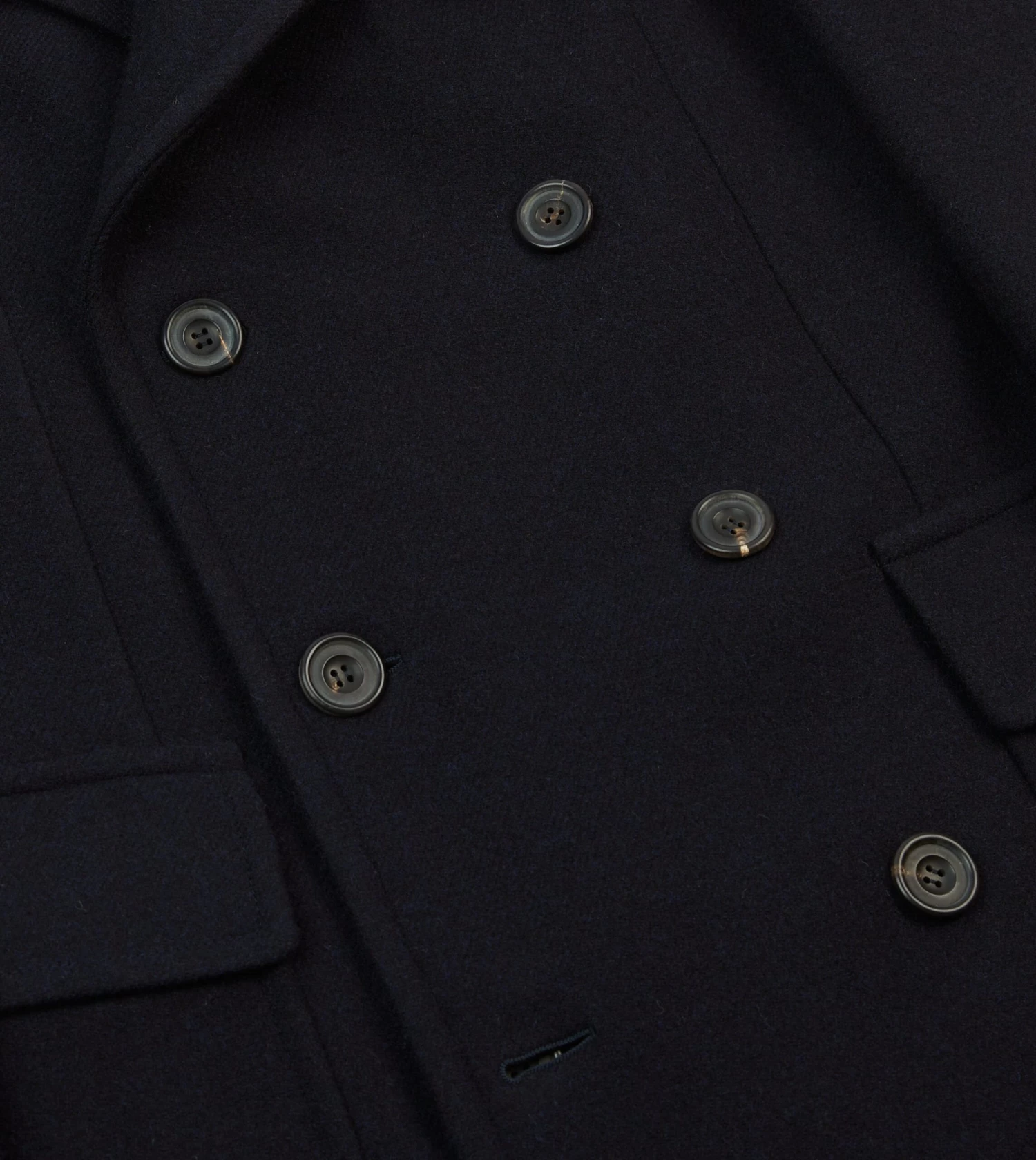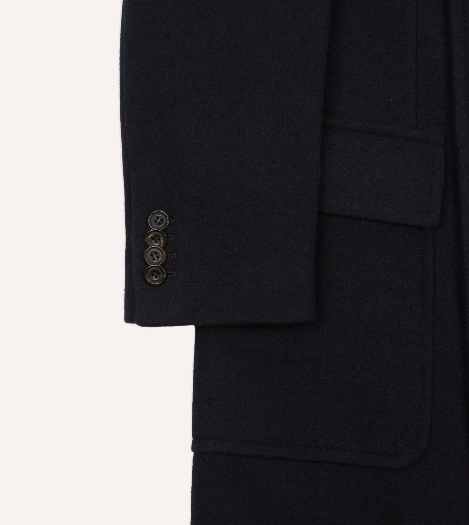 Constructed from a remarkably substantial 14.7oz lambswool cloth from Fox Brothers & Co., the coat has two accommodating outer patch pockets, a flap chest pocket, as well as two internal pockets for valuables. It closes with six weighty horn values, and a serviceable ulster collar. Whether worn over formal tailoring or rugged casualwear, this coat is irreproachable in its quality and timeless style.