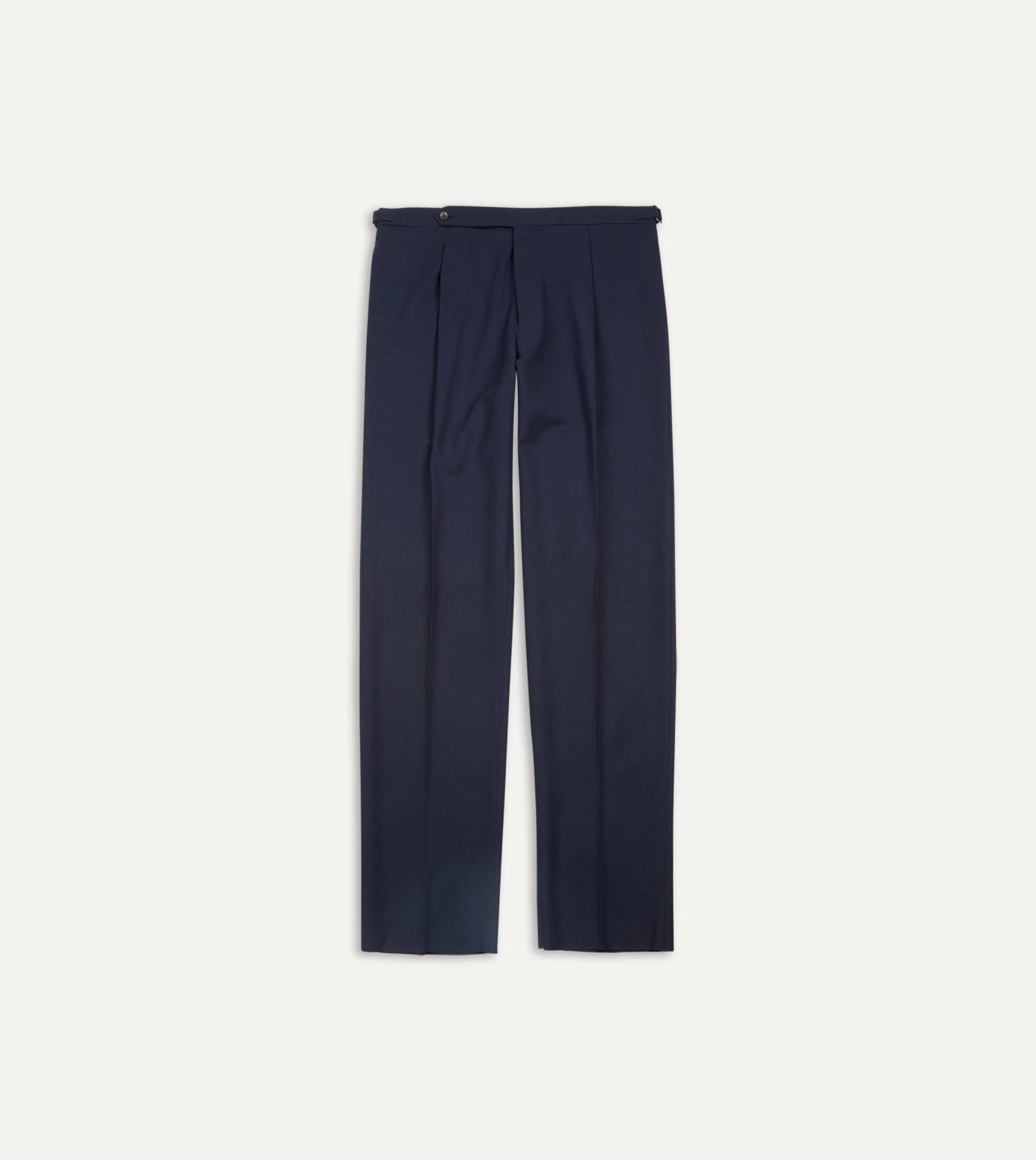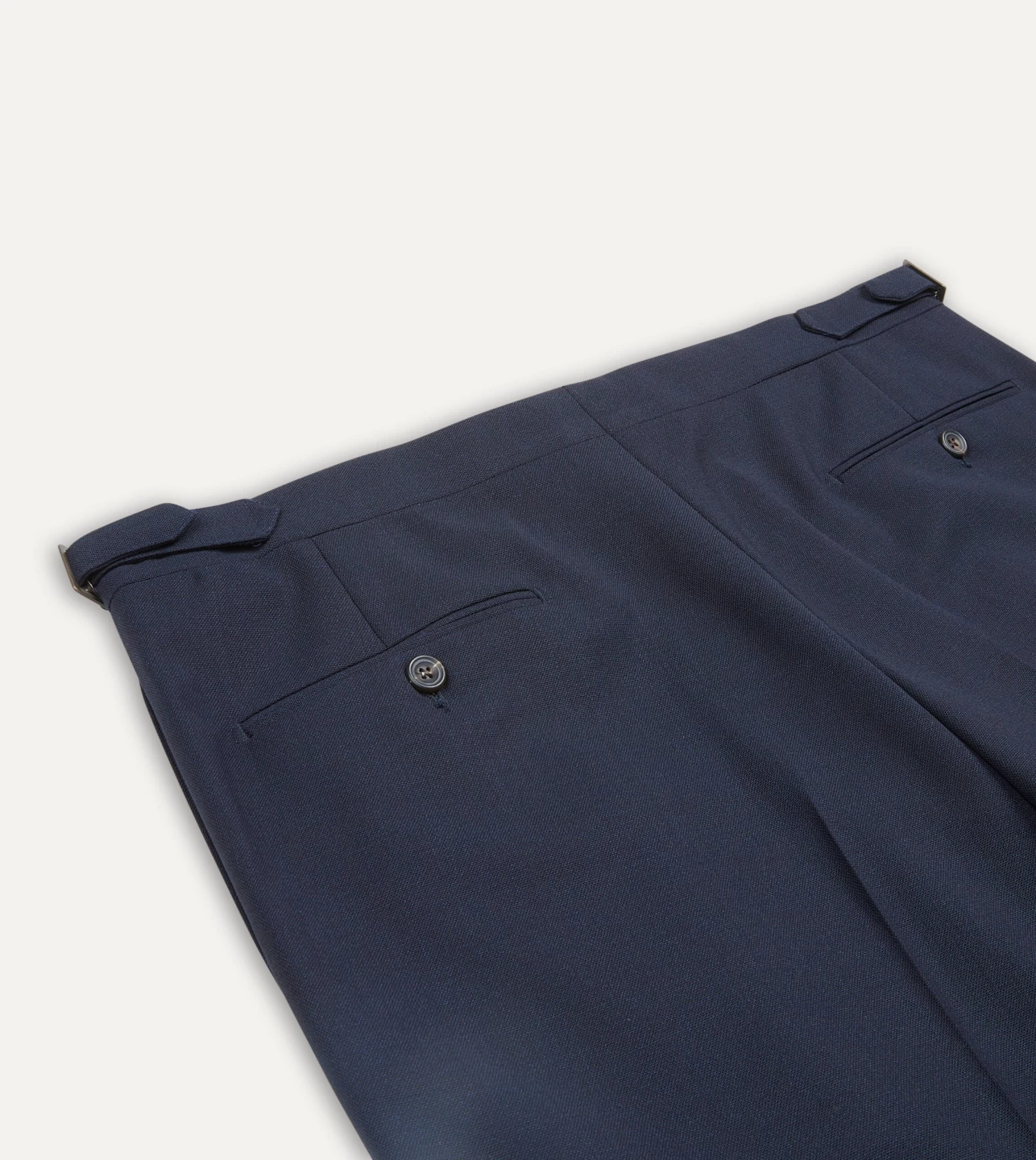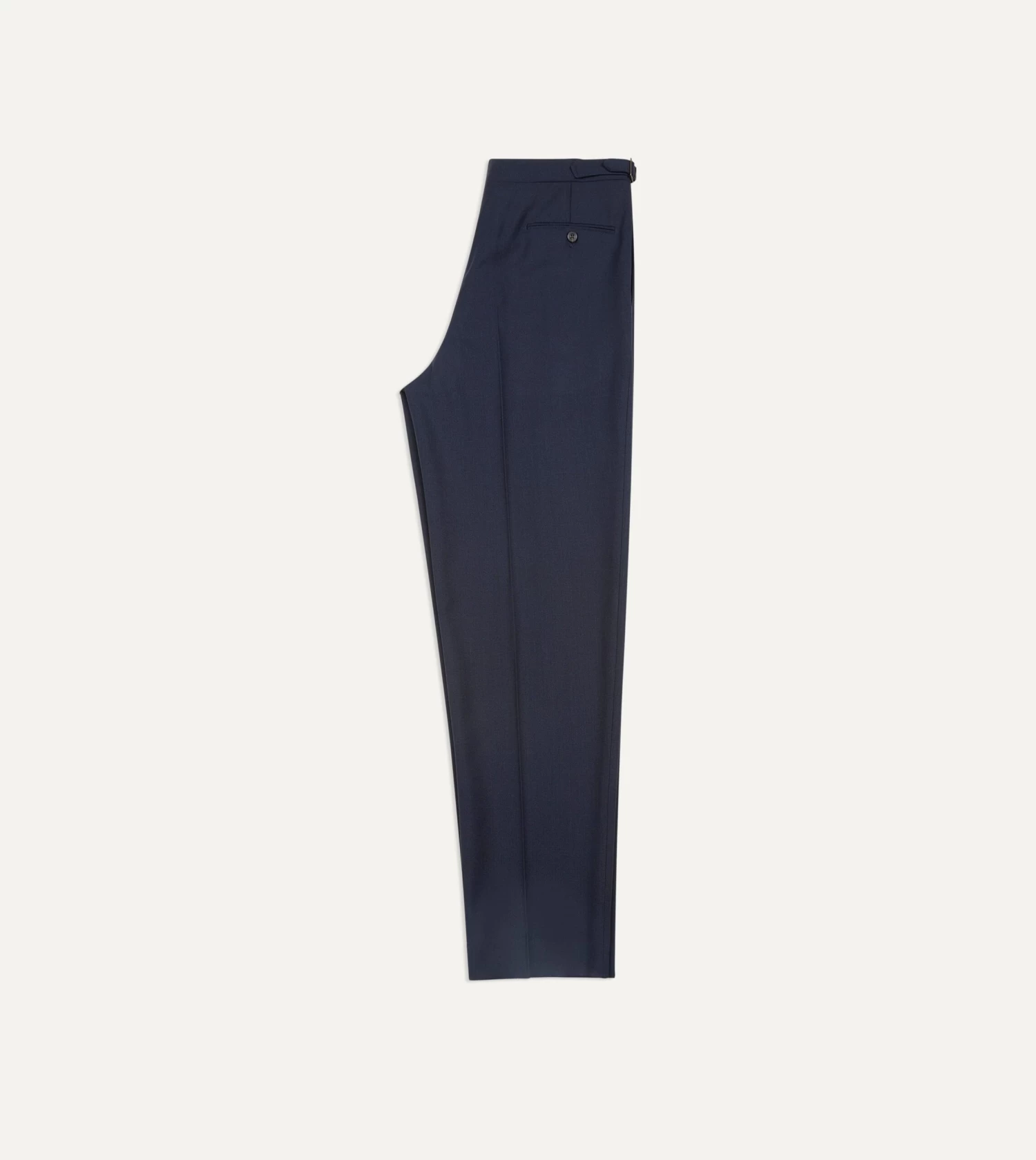 Crafted from a high-twist tropical merino wool, the half-lined trousers feature understated details such as an extended tab front, French bearer valueing with interior waistband curtaining, an after-dinner split to the rear, and side adjusters in lieu of belt loops.