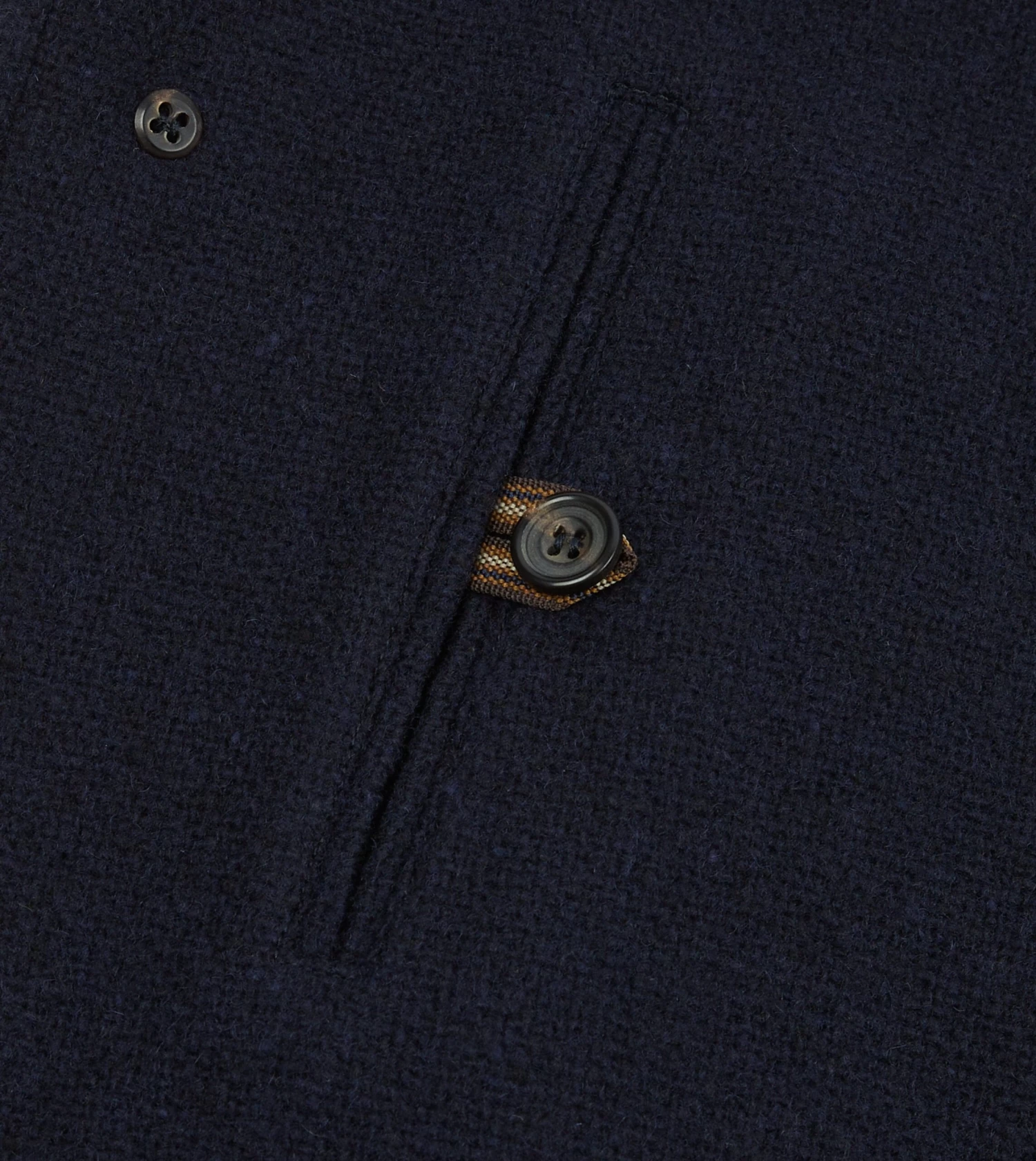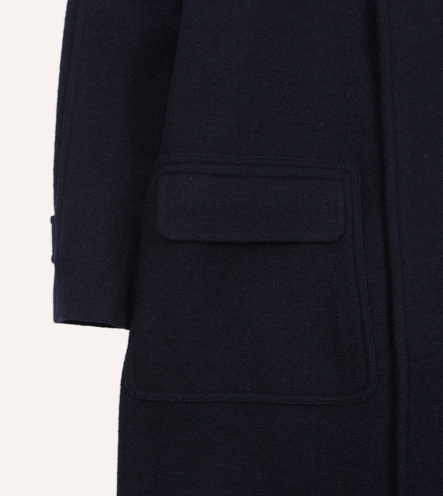 Unstructured and practical in design, the coat features a sturdy, serviceable collar and valueed sleeve straps to defend against the elements, while split raglan shoulders, a fly front and considerable rear vent offer uninhibited manoeuvrability.