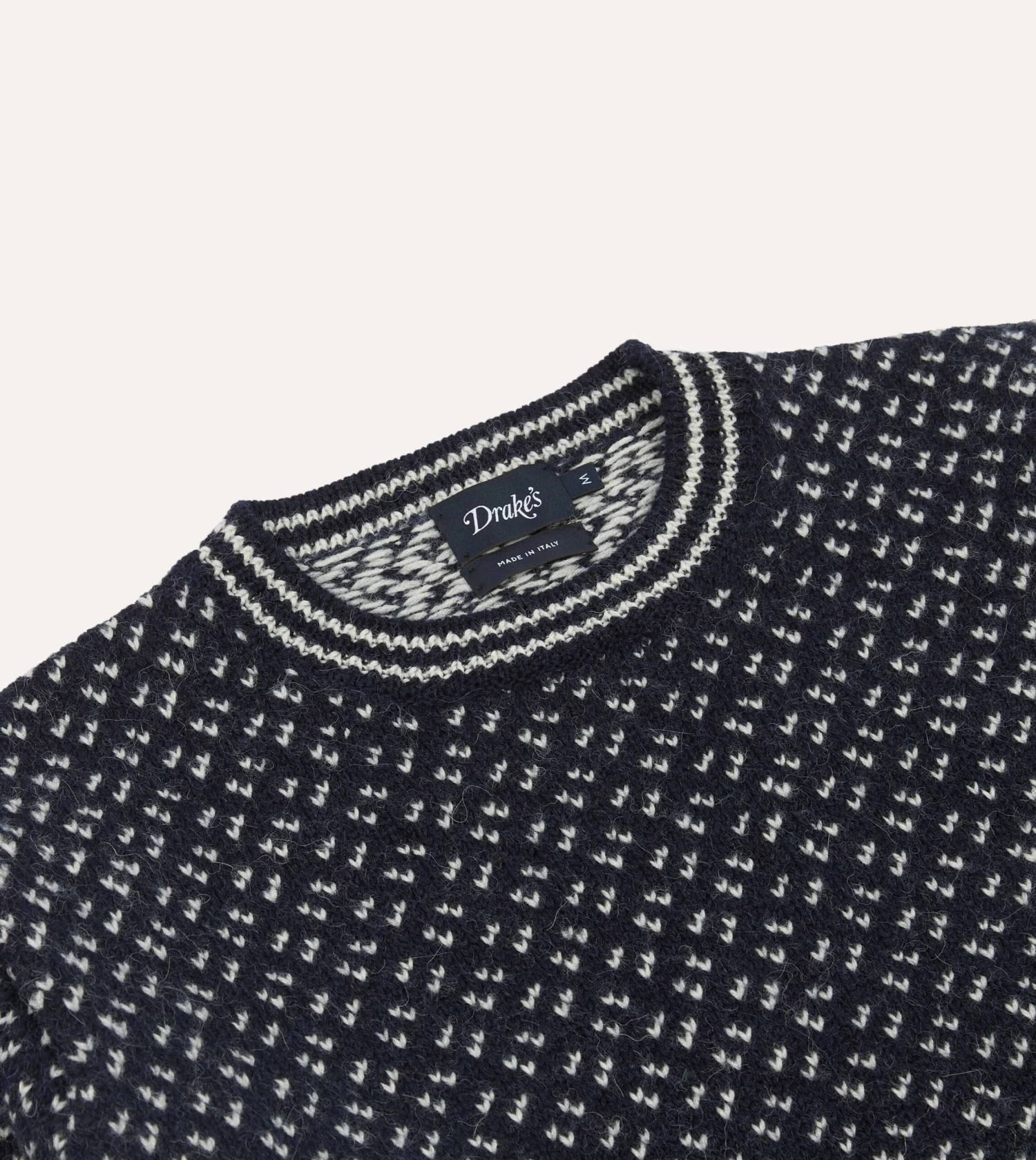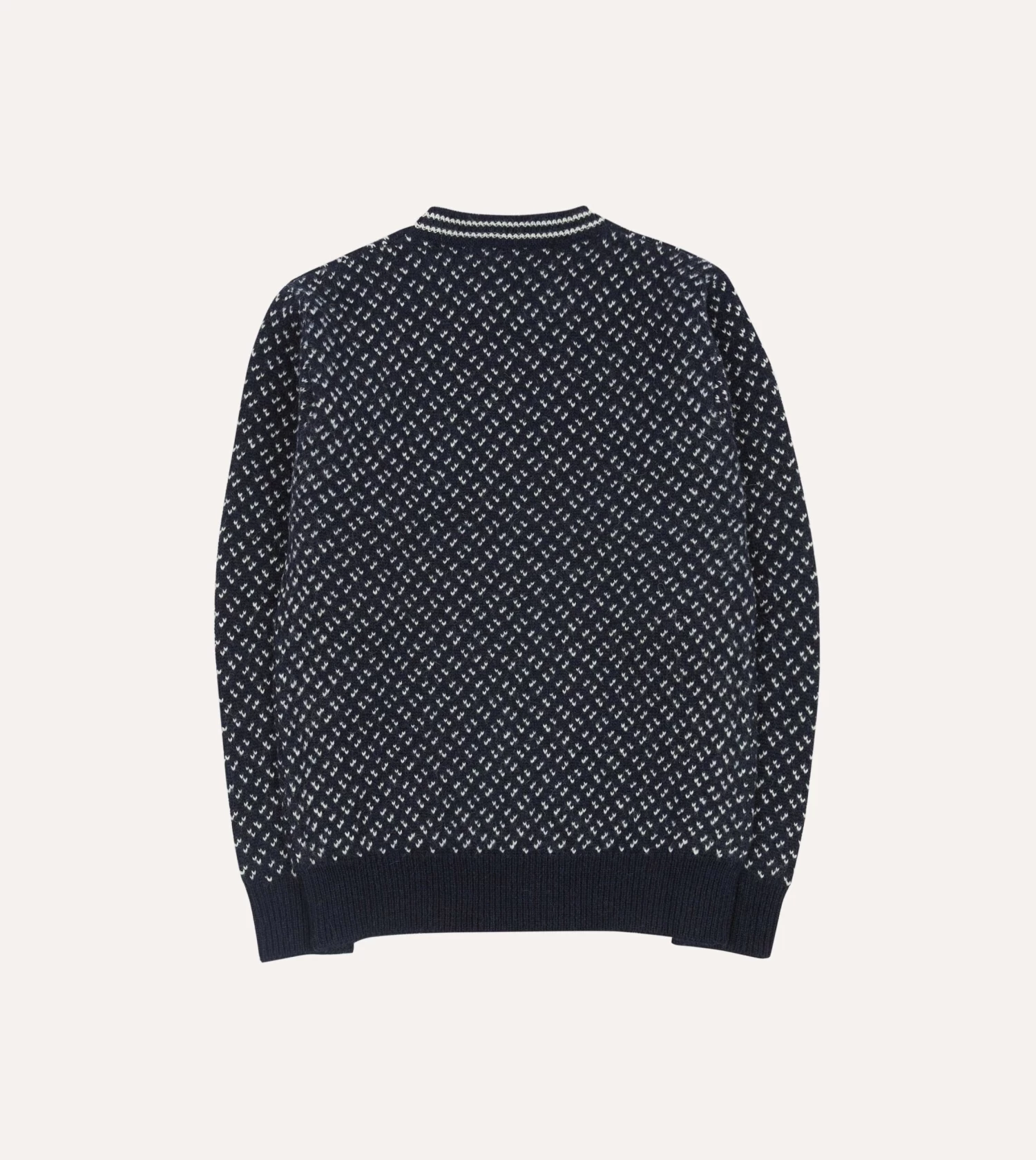 With a ribbed crew neck collar, hem and cuffs and a double-faced jacquard construction, we’ve painstakingly captured the heft and tactility of true seafaring knitwear, whether it’s layered beneath a blazer or thrown over one of our Oxford shirts.