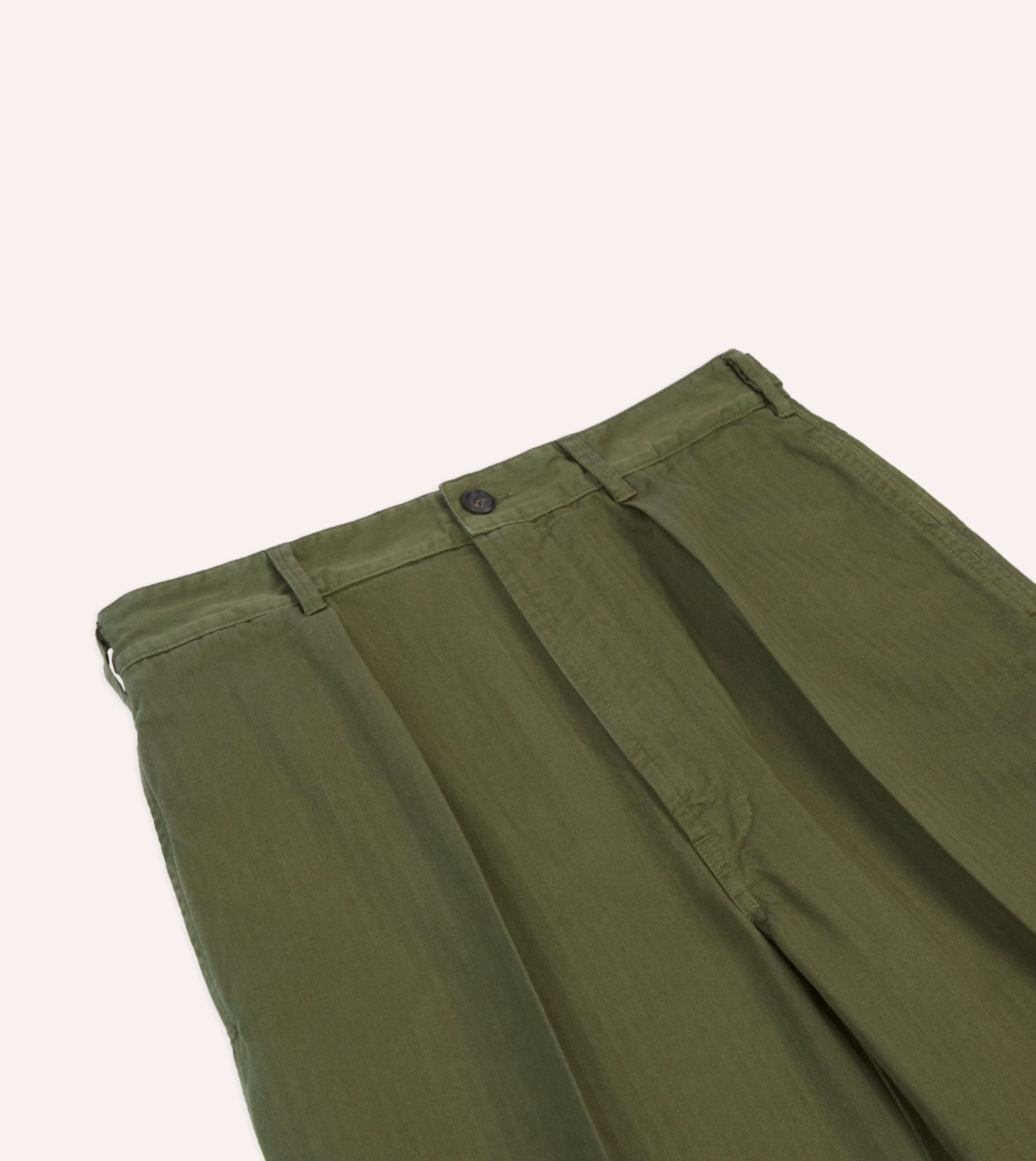 Side adjusters alongside belt loops and a concealed fob pocket keep up the utilitarian nature of these trousers, while a full leg and high rise for a more tailored waist that sits just above the hip creates a classic, mid-century shape.