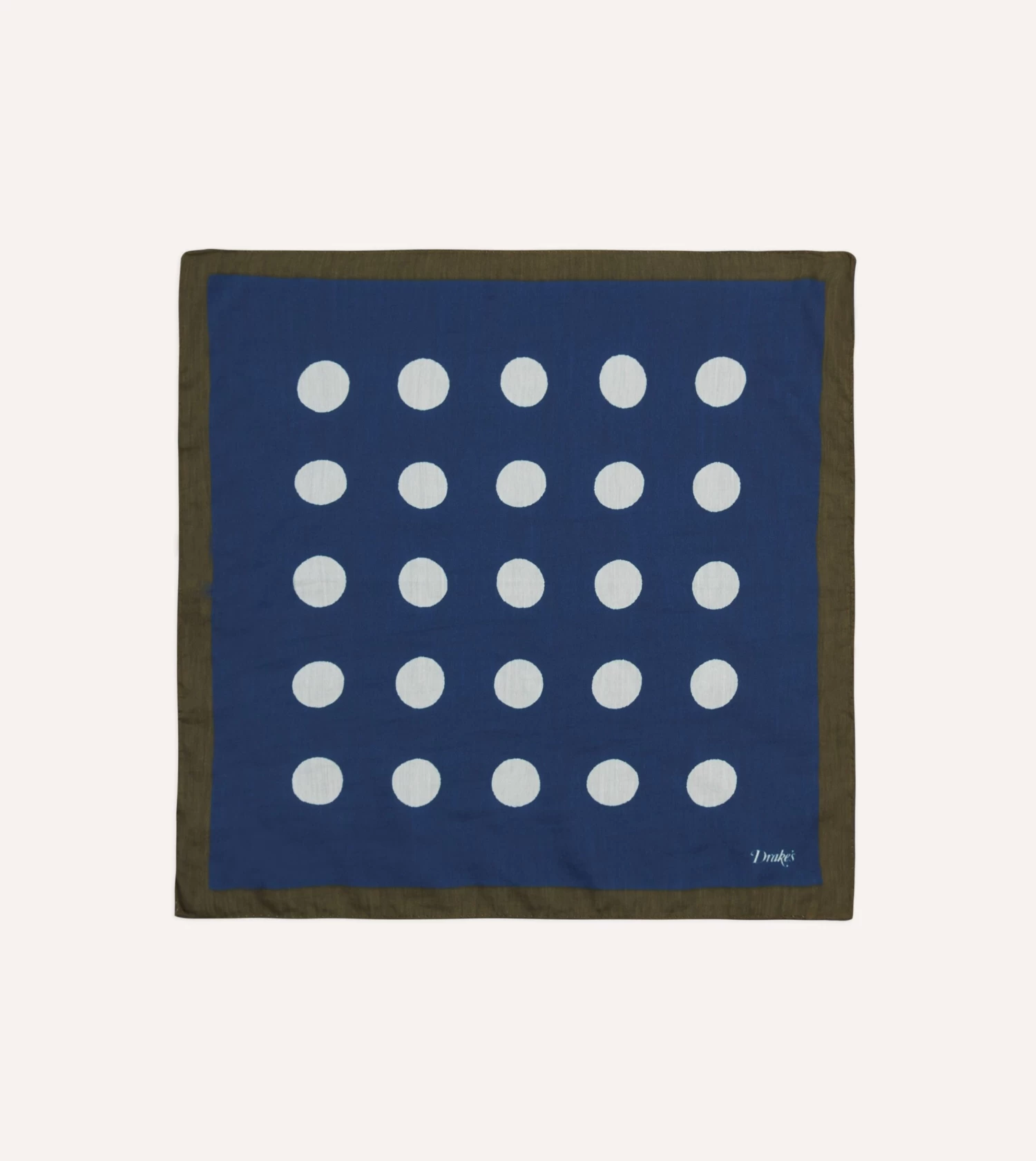 Olive, Navy And Ecru Large Spots Print Cotton-Silk Pocket Square