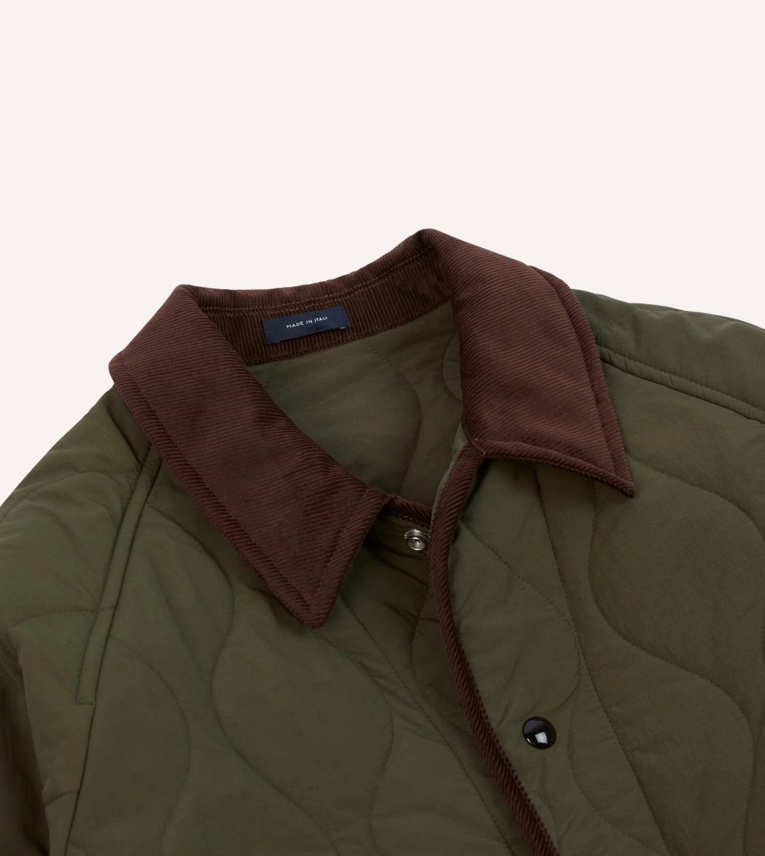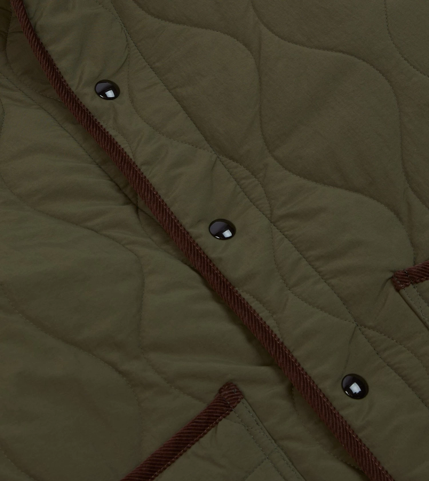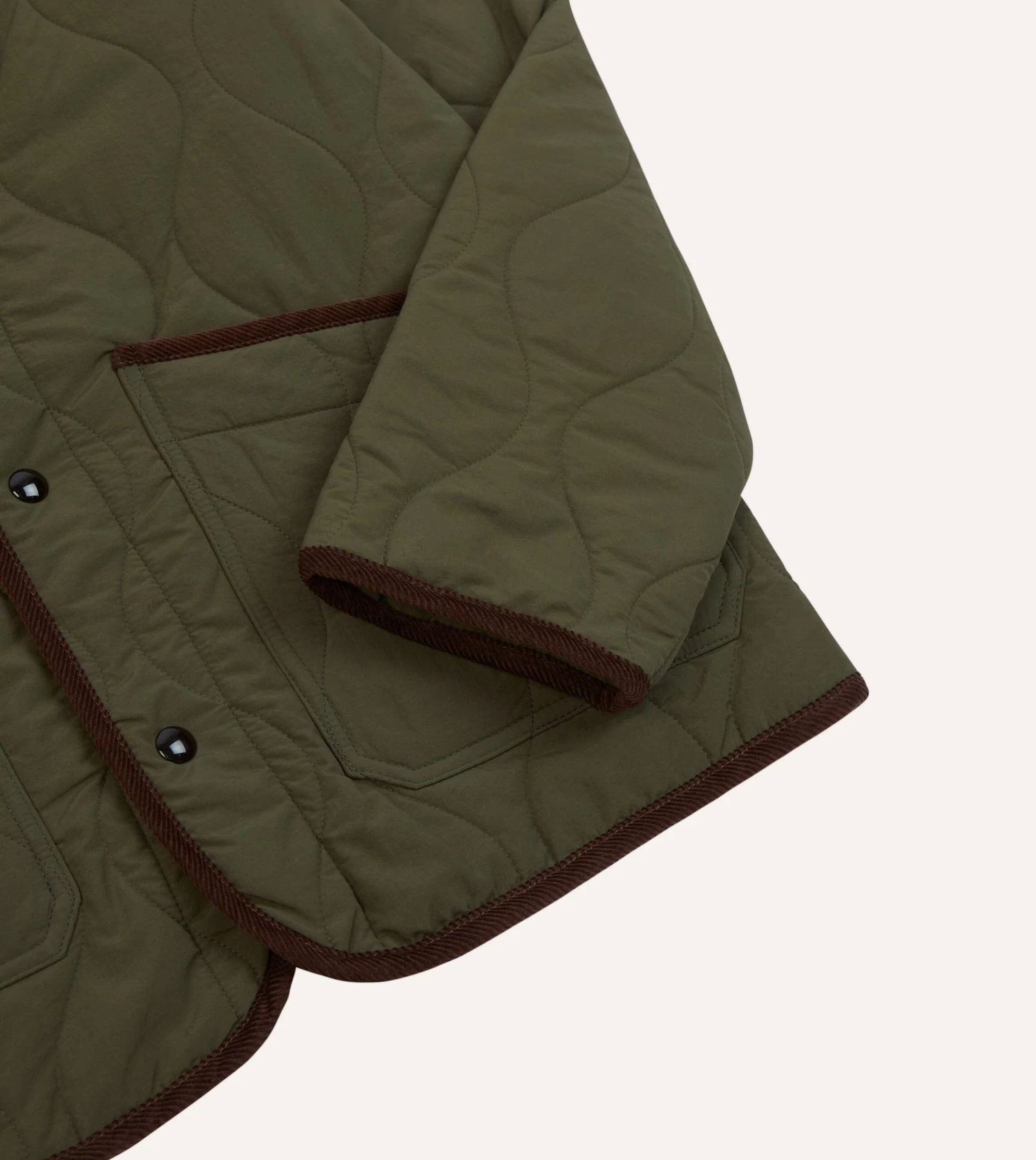 A sporty piece of outerwear with an undeniably rugged charm, this quilted jacket takes its cues from hiking and equestrian clothing. Cut from a lightweight nylon and generously wadded with recycled wool to create a pleasingly voluminous effect, the jacket is finished with five snap values, wide front pockets, and 14 wale corduroy piping.