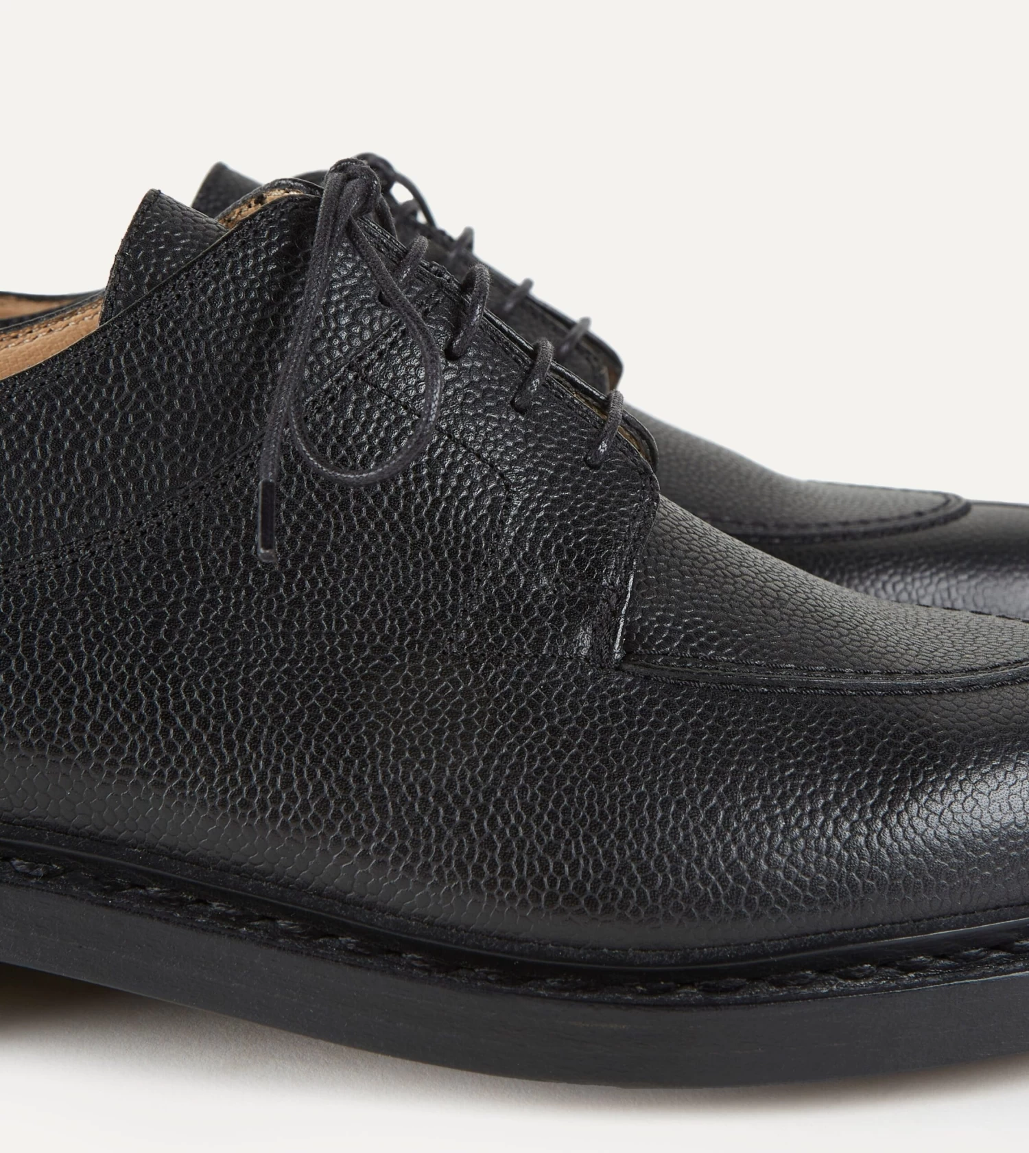 With the same heavy-duty waxy leather uppers and waterproof Norwegian welting that is de rigueur to the French cordwainers, the split toe seam and almond-shaped last add a touch of continental charm that works as well with tailoring as with light denim and a tee beneath a V-neck jumper à la French Ivy.