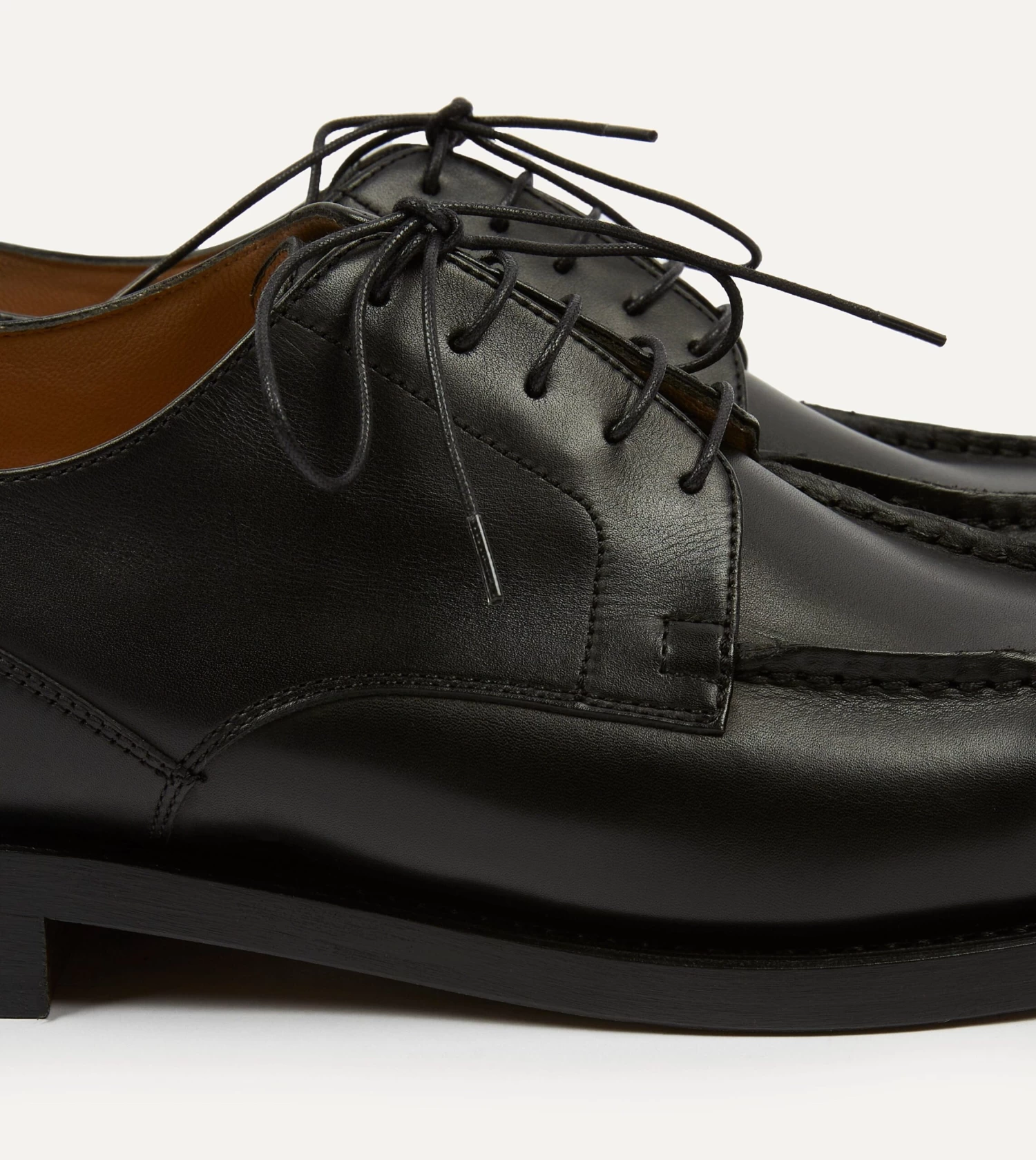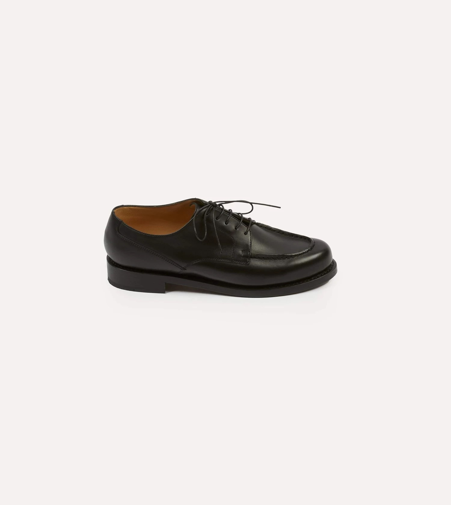 With the same heavy-duty waxy leather uppers and waterproof Norwegian welting that is de rigueur to the French cordwainers, the distinctive apron toe and rounded last add a touch of continental charm that works as well with tailoring as with light denim and a tee beneath a V-neck jumper à la French Ivy.