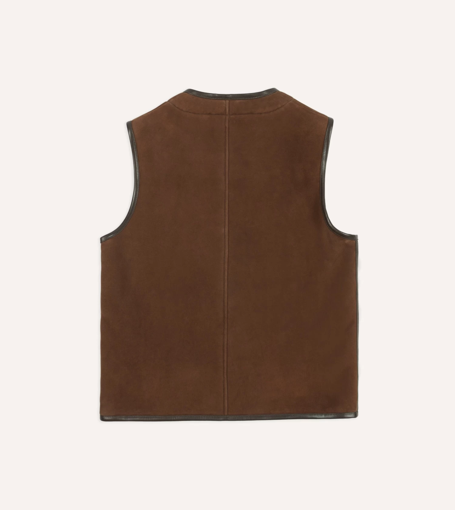 Working with an expert leather maker in Italy we created this snap value front vest, using a beautifully substantial suede. Rather than line the garment, we kept the shearling side of the suede, which faces inwards towards the wearer, ensuring maximum warmth.