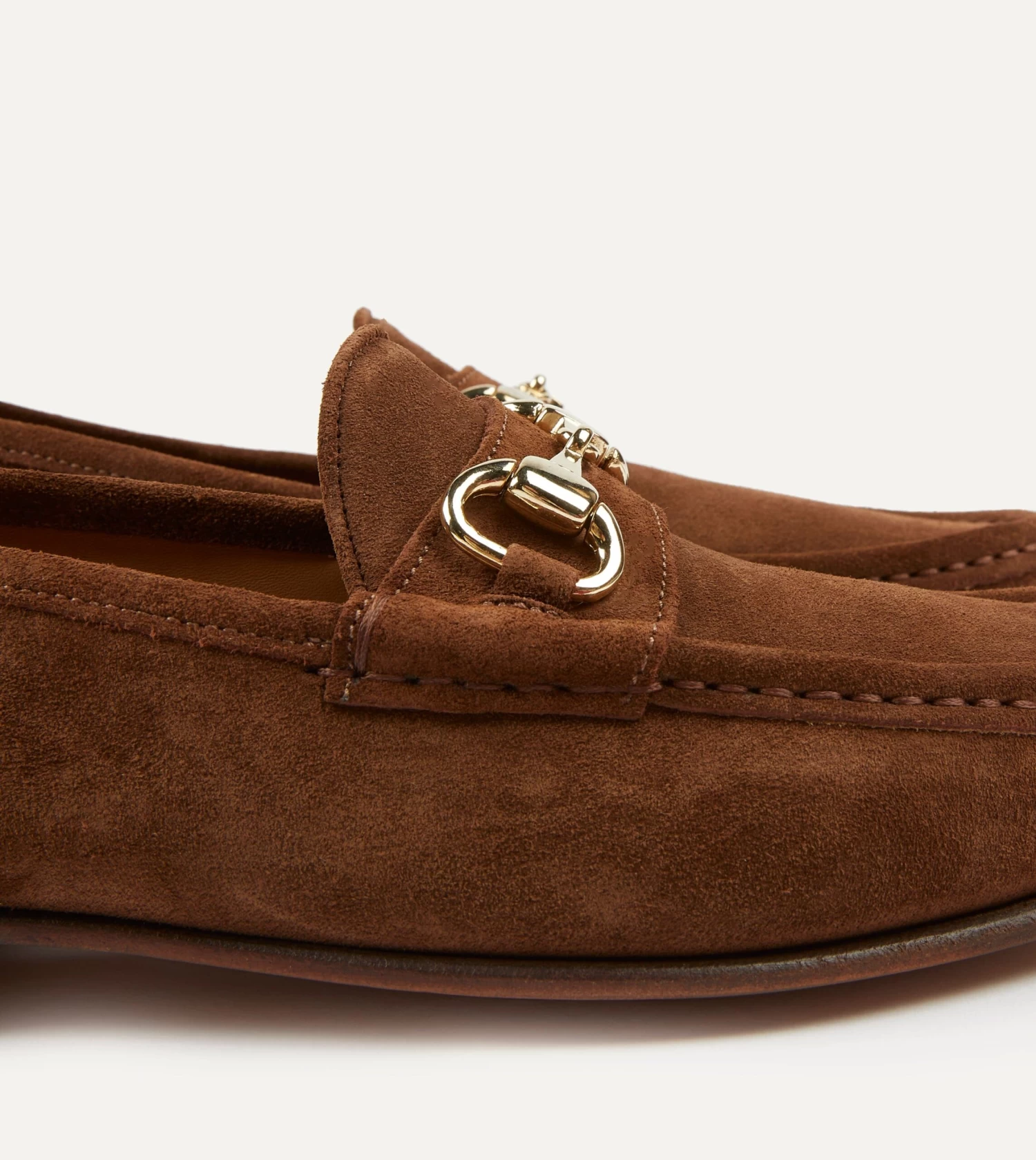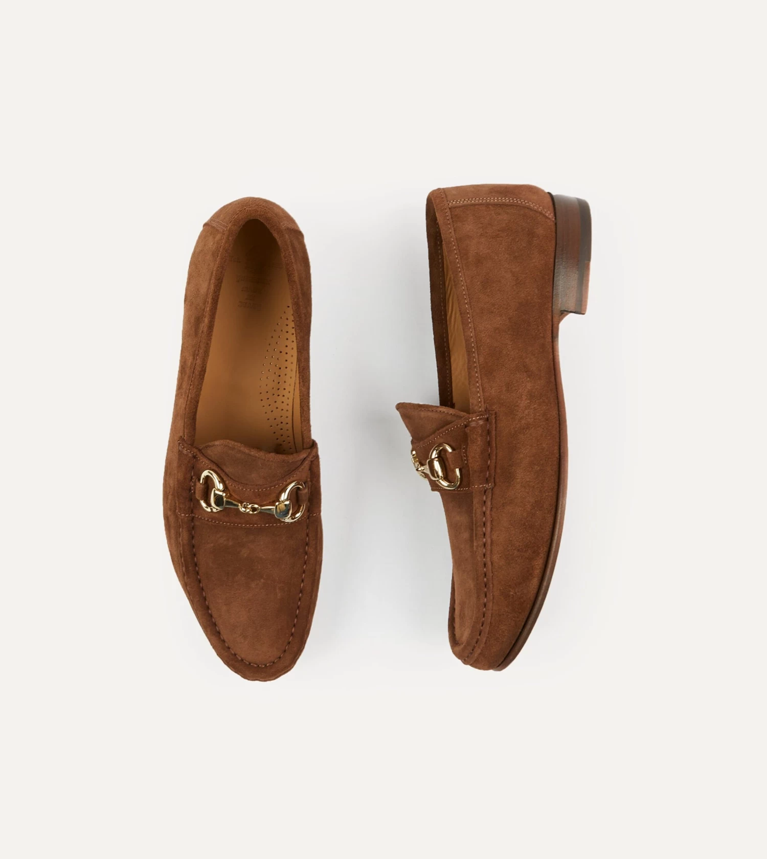 The Moc Ischia from Yuketen is a traditional Italian moccasin loafer constructed from premium suede with distinctive horse bit ornamentation adding an equestrian touch.